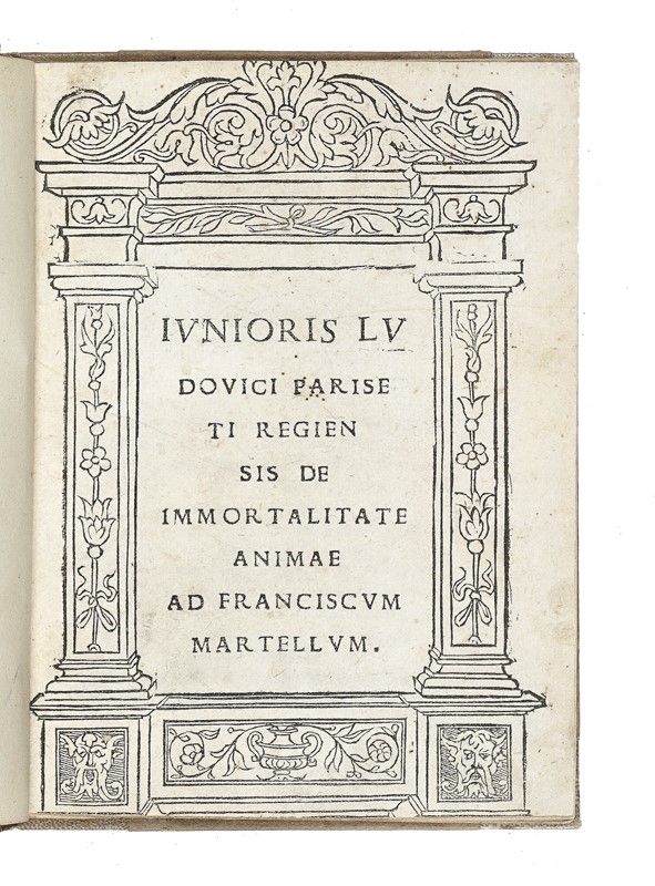 In-4° (mm 185x134). Carte [70]. Frontespizio in cornice xilografica e iniziali xilografiche. Esemplare rifilato corto, soprattutto al frontespizio, occasionali piccole arrossature e qualche pallida fioritura. Assenti le ultime due carte bianche (I7 e I8). Mezza pergamena con punte, piatti in cartonato.