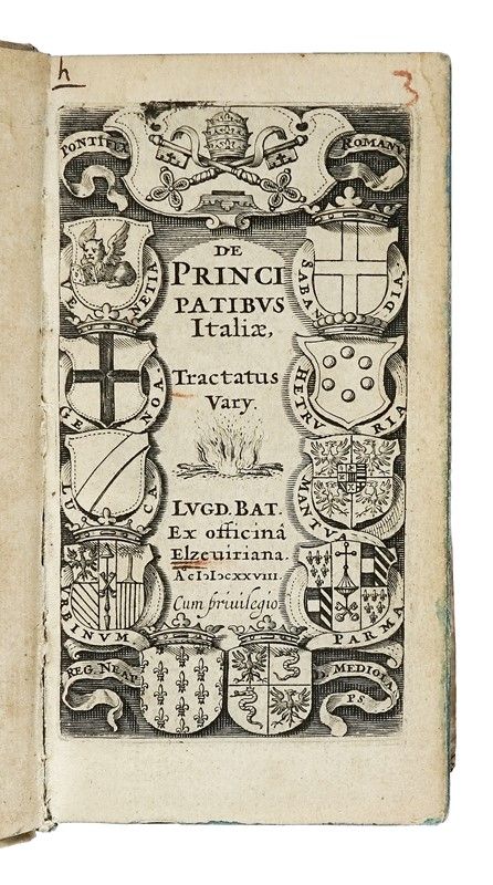In-24° (mm 109x55). Pagine: 318, [16], ultime 3 carte bianche. Frontespizio calcografico con gli stemmi di varie città italiane dell'epoca. Qualche macchiolina, nel complesso in buono stato. Piena pergamena coeva con titolo entro pecetta sul dorso, tagli blu.