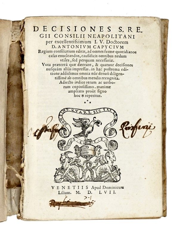 In-8° (mm 149x101). Carte [44], 255, [1]. Marca editoriale xilografica al frontespizio, iniziali xilografiche e testo su due colonne in romano e corsivo. Antica nota di possesso manoscritta al frontespizio, occasionali fioriture sbiadite, esemplare rifilato, fascicolo con i due fogli di guardia quasi totalmente slegato. Piena pergamena coeva flessibile, con titoli manoscritti al dorso (quasi staccato).