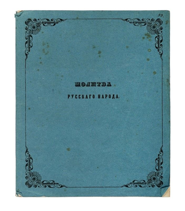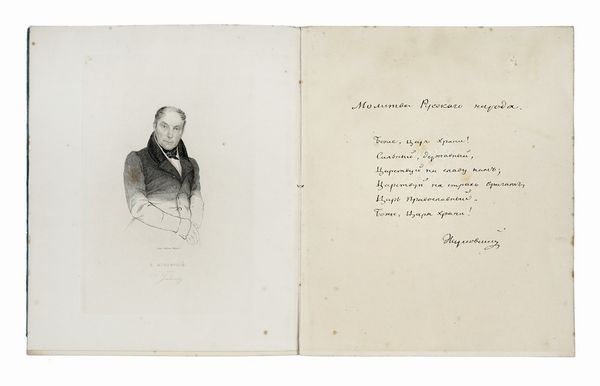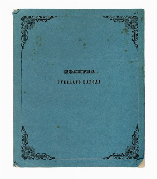 Libretto a stampa, in russo, tedesco e francese. Cinque carte e una velina. Con dedica autografa al cantante Calzolari a penna nera di Aleksej L'vov, in francese, datata 7 febbraio 1855. Legatura in brossura azzurra con il titolo in russo Preghiera del popolo russo. Ottime condizioni. Dimensioni 200x240 mm.