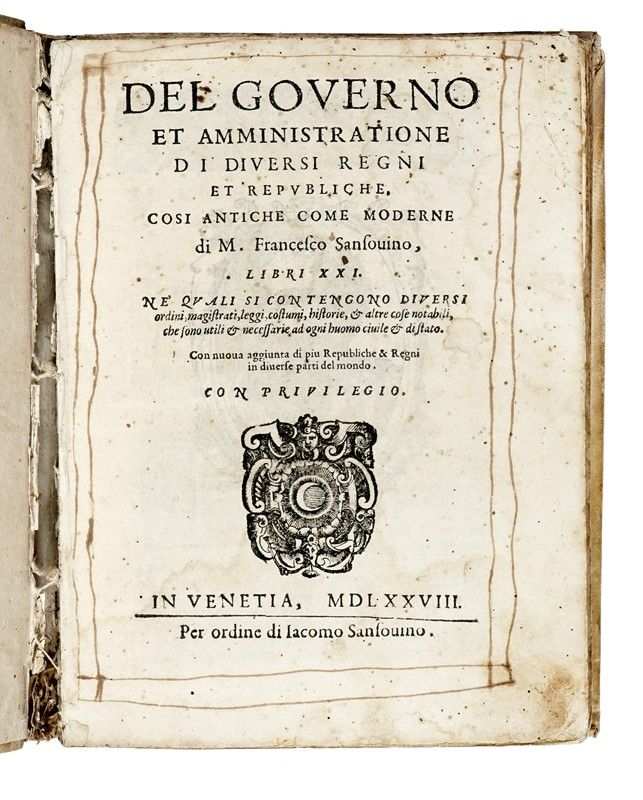 In-4° (mm 195x146). Carte: [8], 200 con ritratto dell'autore al verso del frontespizio. Frontespizio con vignetta xilografica e doppia cornice disegnata da antica mano, fregi ed iniziali xilografiche. Qualche pallida gora e altri minimi segni del tempo. Piena pergamena settecentesca rigida con titoli manoscritti al dorso.
