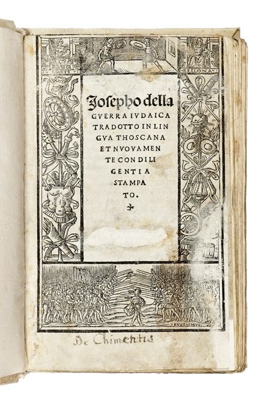 In-8° (mm 150x94). Carte 324. Frontespizio entro cornice xilografica raffigurante scene di guerra, testo in corsivo e gotico, bella marca xilografica al colophon. Nota di possesso manoscritta al margine inferiore del frontespizio, con restauri al margine esterno inferiore e al centro nella parte bianca, restauri anche all'angolo esterno inferiore di a2 e u6. Margine superiore leggermente corto (che tocca il frontespizio), qualche trascurabile segno del tempo. Pergamena semi-flessibile moderna.