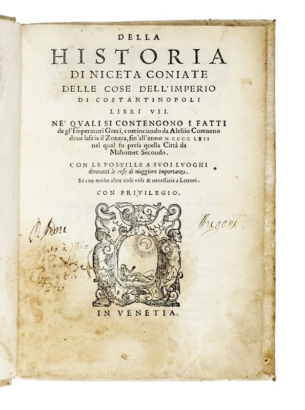 In-4° (mm 198x138). Carte: [4], 111, assente l'ultima carta bianca 2E4. Frontespizio con marca tipografica, fregi e capilettera editoriali. Evidenti gore, macchie e segni del tempo. Piena pergamena posteriore con titoli manoscritti al dorso.