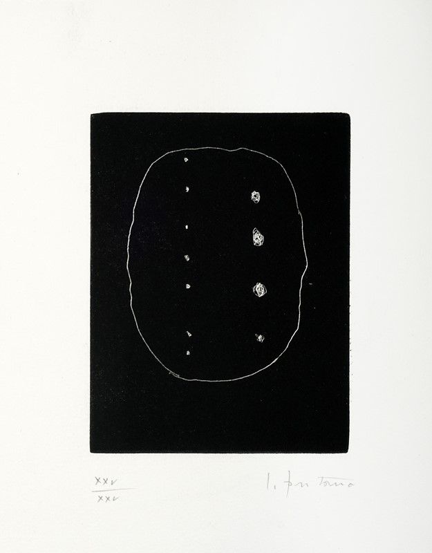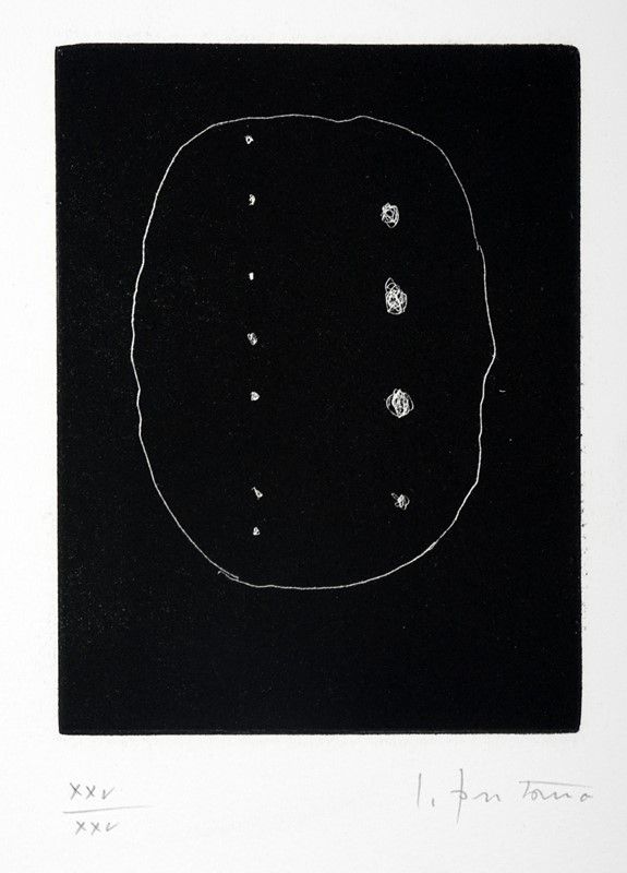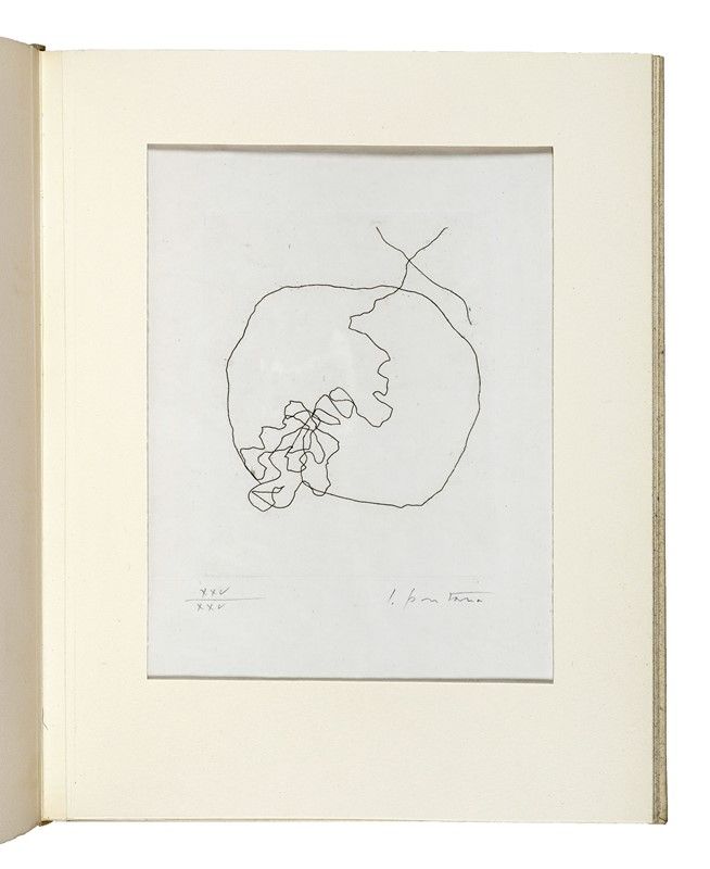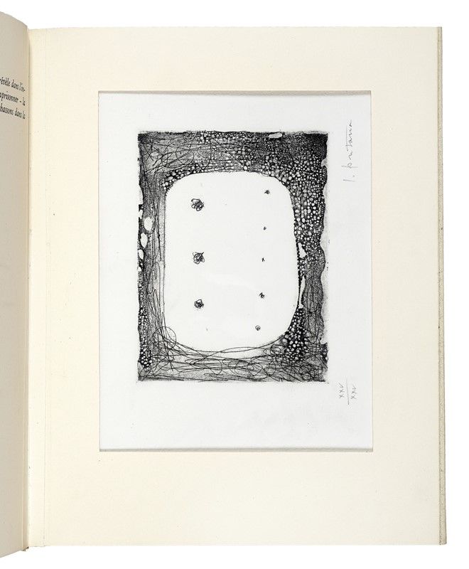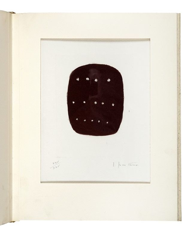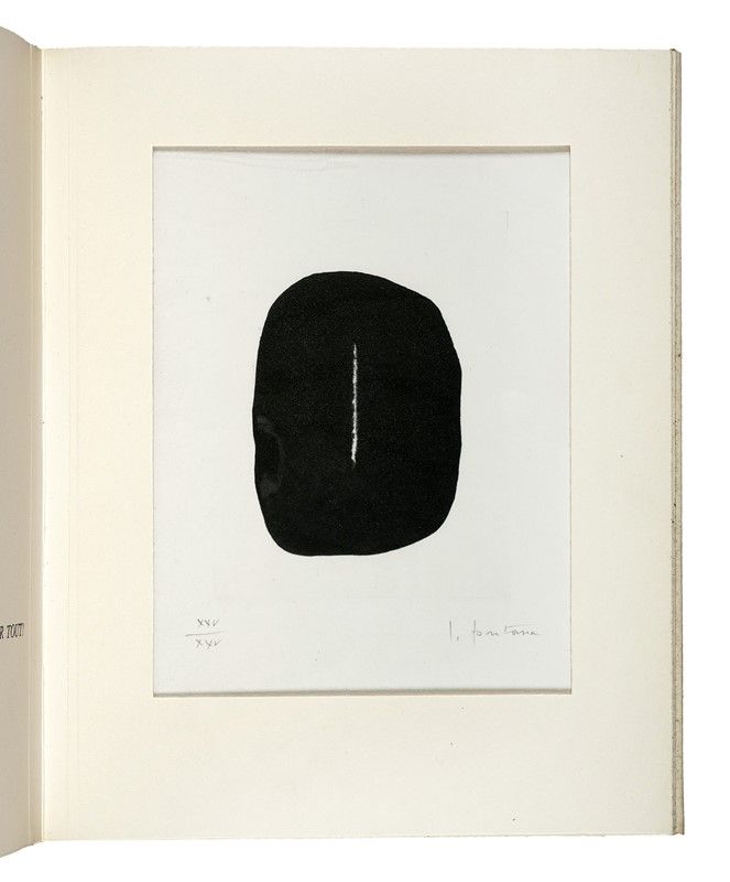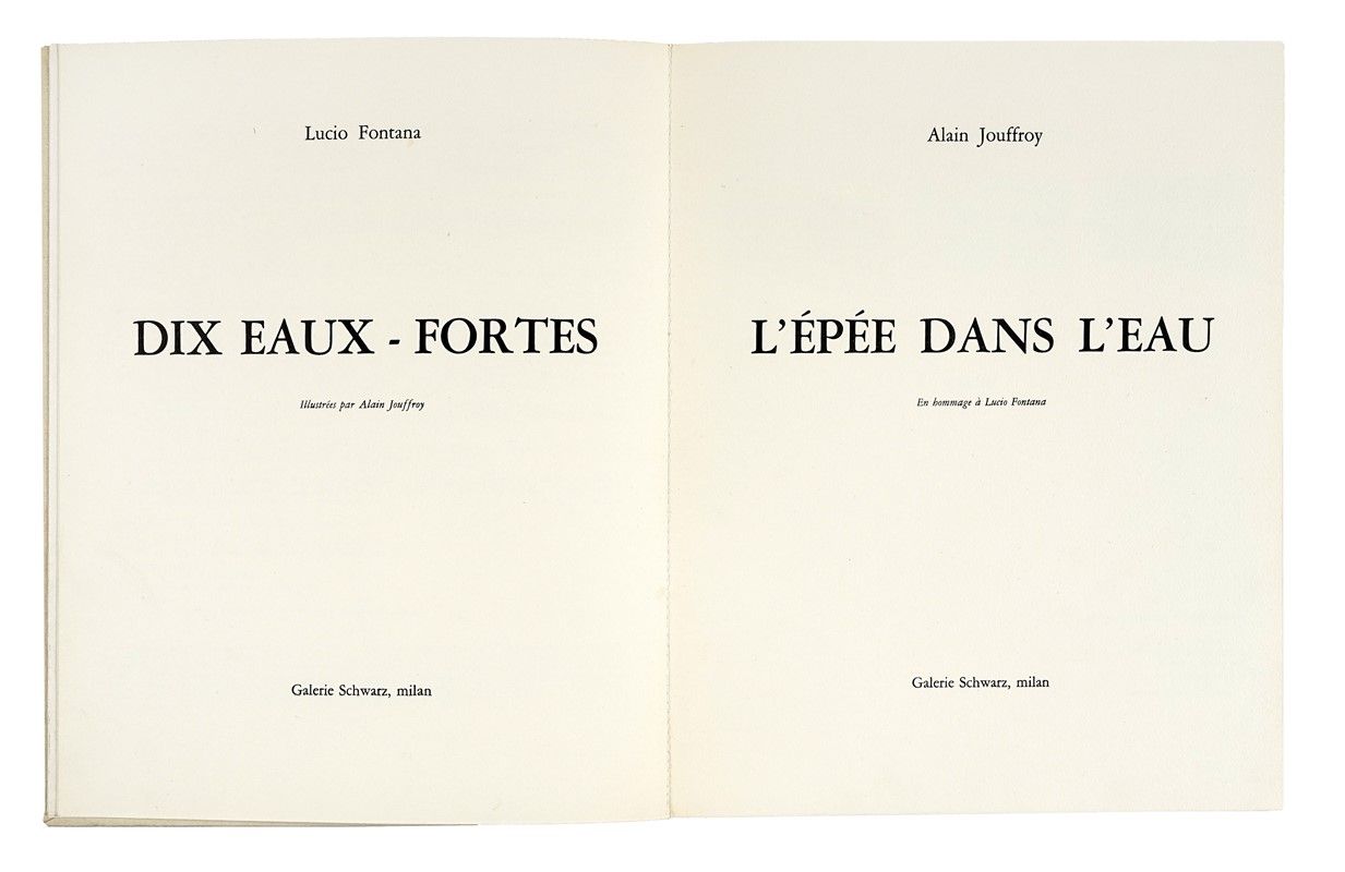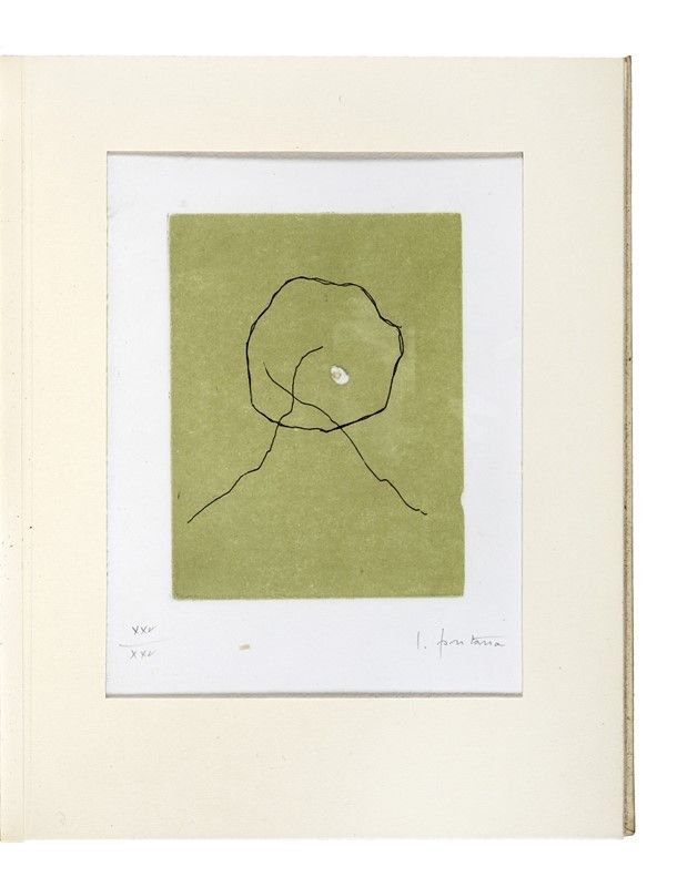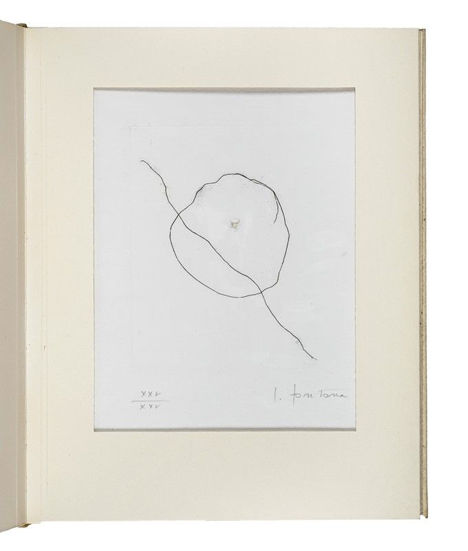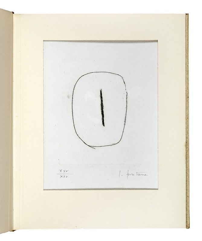 In-4° (mm 300x240). Carte [14] con 10 meravigliose acqueforti e acquetinte originali di Lucio Fontana a piena pagina fuori testo (mm 250x200), numerate a matita in basso a sinistra e firmate l. fontana a matita in basso a destra. Ciascuna inserita in un bifolio con plastica protettiva alla prima carta; tutte le incisioni, ad eccezione della seconda, risultano parzialmente applicate al recto della seconda carta del bifolio. Legatura editoriale in piena tela con un'illustrazione in nero e oro al piatto anteriore e titoli in nero al piatto e al dorso. Lievemente sbiaditi i titoli al dorso e tracce di polvere diffuse ai piatti. Entro custodia editoriale in cartonato con targhetta della Galleria Arte Borgogna applicata al piatto posteriore. Lievi mancanze e difetti marginali. Uno dei 25 esemplari in numeri arabi destinati ai collaboratori, su una tiratura complessiva di 100 copie numerate.