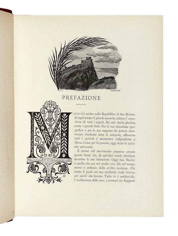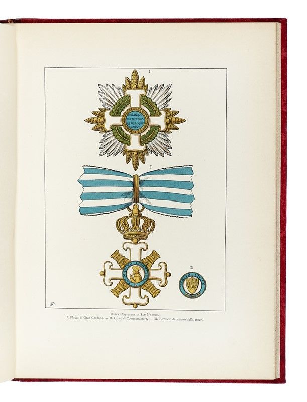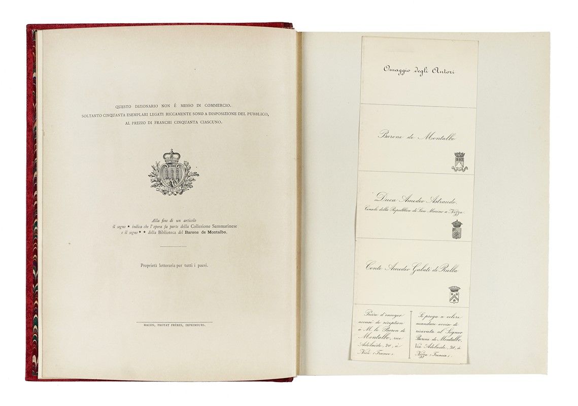 In-4° (mm 291x223). Pagine: [XXVI], 321, [3]. Ottimo esemplare con elegante legatura in marocchino rosso al dorso con titoli dorati e stemma di San Marino in oro, piatti in percallina rossa con al centro del piatto anteriore lo stemma dorato di San Marino. Risguardi decorati con carta marmorizzata. All'interno è presente anche il biglietto originale "Omaggio degli Autori". Opera prodotta in 50 esemplari non destinati al commercio.