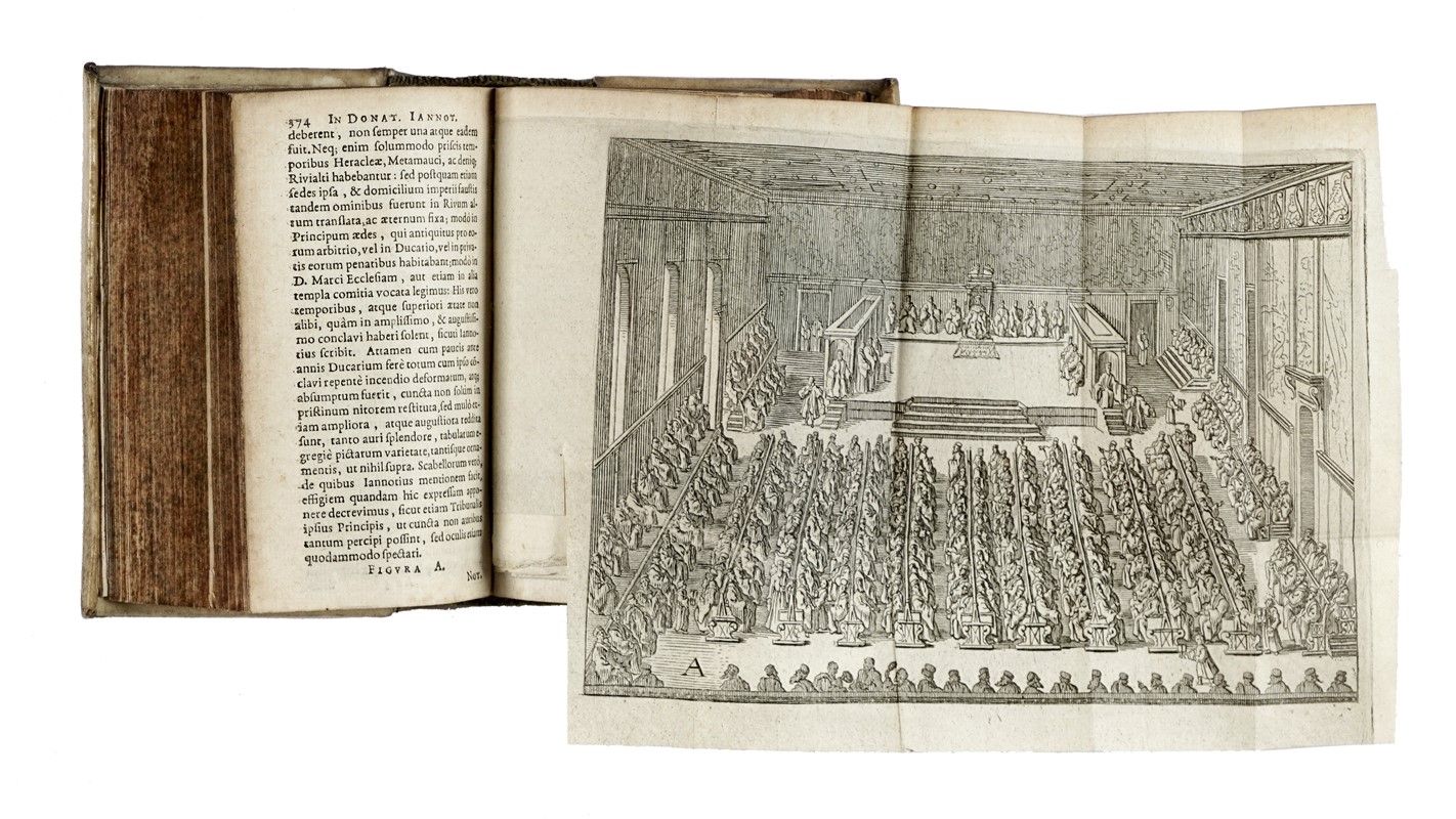 In-16° (mm 102x57). Pagine: [4], 467, 7 tavole ripiegate. Frontespizio calcografico ed eleganti tavole ripiegate in ottime condizioni. Qualche segno di uso nel tempo. Piena pergamena coeva con titolo in oro al dorso entro tassello in pelle nera con una leggera abrasione. LEGATO CON: Habernfeld Andreas, Bellum Bohemicum recensente Andraea ab Habernfeld ab anno 1617. Lugduni Batauorum: 1646 (i.e. 1645).