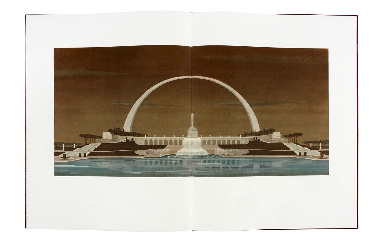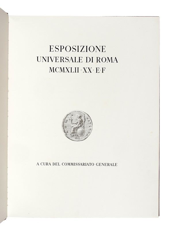 In-folio massimo (mm 580x445). Ottimo esemplare, leggermente fiorito, con 2 ritratti fotografici di Vittorio Emanuele III e di Mussolini e numerose grandi illustrazioni a colori nel testo, di cui 4 a doppia pagina. Legatura editoriale in similpelle rossa con fregio a secco sul piatto anteriore, fasci littori su quello posteriore e titoli in oro al dorso. Entro cartella editoriale in tela beige, con titoli al piatto, difetti ai tagli e fioriture ai piatti. Biglietto di Cipriano Efisio Oppo (pittore, critico d'arte e vice-presidente dell'Ente Autonomo Esposizione Universale di Roma) conservato all'interno, con segni di graffetta metallica.