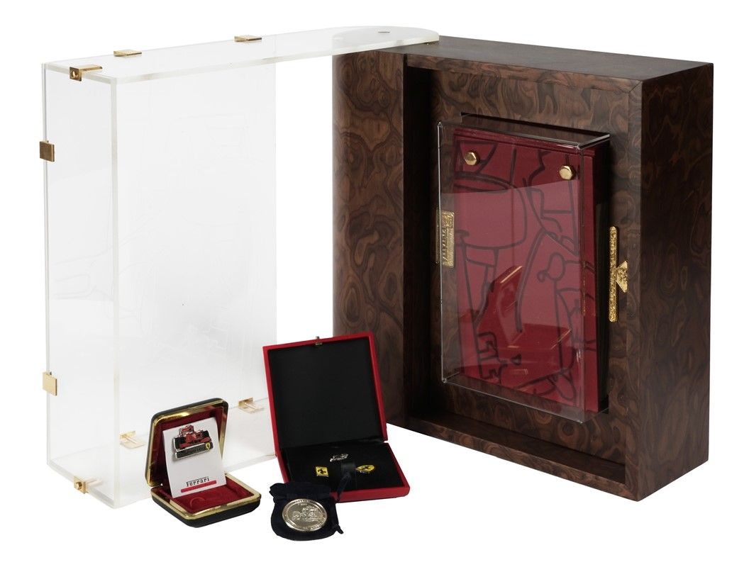 In-8° oblungo (mm 120x210). Con numerose riproduzioni fotografiche in oro, precedute da foglio pergamenaceo didascalico con testo in rosso e nero. Ciascuna pagina presenta il margine interno in pelle bordeaux. Legatura editoriale in piena pelle con bulloni dorati e impressioni a secco al piatto anteriore. Entro cofanetto editoriale in legno e plexiglass, con targa dorata. Chiusura con chiave e bullone laterale; allegato anche il manuale d'istruzioni per l'apertura. Lievi difetti al plexiglass messo a protezione del libro, altrimenti tutto perfettamente conservato entro scatola originale in cartone rosso, con titoli in oro al piatto anteriore. Uno dei 500 esemplari in numeri arabi, su una tiratura complessiva di 520 copie. SI AGGIUNGE: Una moneta Ferrari Campione del Mondo 2004 in custodia Bolaffi in velluto blu. SI AGGIUNGE: Una spilla Ferrari F60 in cofanetto in pelle nera e oro. SI AGGIUNGONO: Tre distintivi ufficiali Ferrari in cofanetto editoriale in pelle rossa.