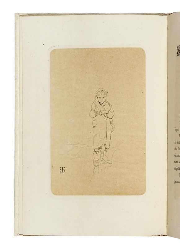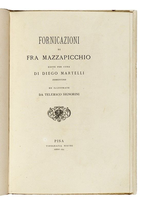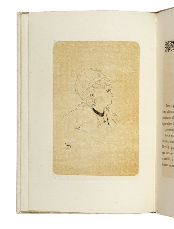In-8° (mm 238x160). Pagine 21, [3]. Con 3 belle acqueforti di Telemaco Signorini su fondo ocra. Testatine e finalini in legno nel testo. Esemplare ben conservato. Legatura moderna in pieno cartonato muto, con sguardie rinnovate. Edizione di 100 esemplari non numerati.