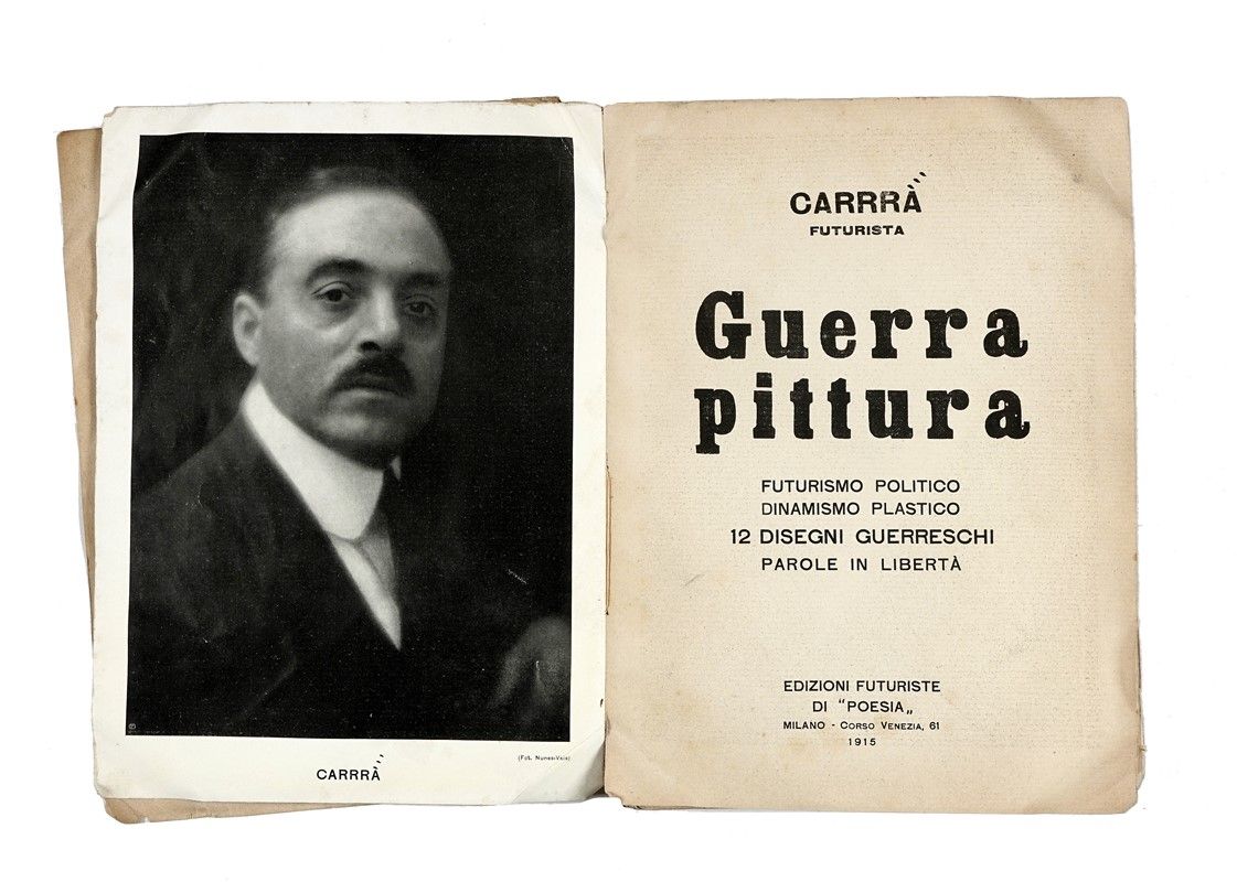 In-8° (mm 260x190). Con 1 ritratto fotografico dell'Autore di Nunes-Vais, 12 tavole di Disegni Guerreschi, di cui una ripiegata, 2 tavole ripiegate in fine (riproduzione del Programma politico futurista, 1913; riproduzione della Sintesi futurista della guerra, 1914). Il tutto in bianco e nero, fuori testo. Numerose composizioni parolibere nel testo. Brossura editoriale, con dorso assente, fioriture e tracce marginali di carta velina ai piatti. Esemplare completamente sfascicolato, con le prime tavole slegate. Internamente in buona conservazione, salvo qualche piega e rare fioriture marginali. Copia da studio, non passibile di restituzione. Menzione fittizia del migliaio al piatto posteriore. Annotazione manoscritta Vieri Nannetti al foglio di guardia anteriore.