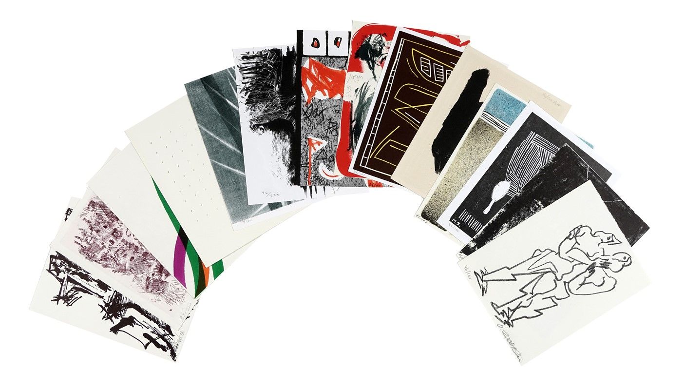 1 catalogo in-8° (mm 225x174) con le riproduzioni in bianco e nero delle opere di Hans Arp + 1 suite di 14 splendide incisioni originali (acqueforti, litografie e linoleografie) di Max Bill, Camille Bryen, Piero Dorazio, Hans Hartung, Bernhard Heiliger, Marcel Janco, Asger Jorn, Alberto Magnelli, Robert Motherwell, Giuseppe Santomaso, Michel Seuphor, Antoni Tàpies, Fritz Wotruba, Ossip Zadkine, tutte firmate e numerate a matita dagli Artisti. La suite è custodita in una cartella editoriale in mezza tela, con titoli al piatto anteriore (mm 228x175). Il tutto perfettamente conservato entro cofanetto editoriale in mezza tela. Uno dei 100 esemplari in numeri arabi, su una tiratura complessiva di 120 copie.