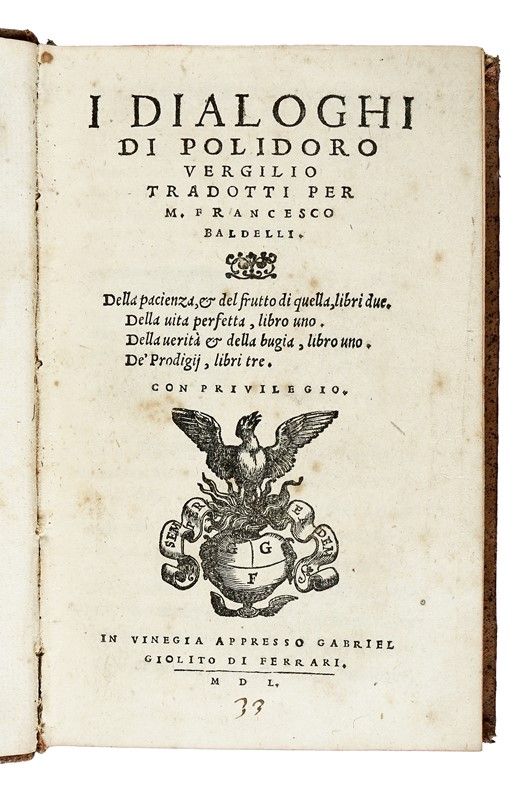 In-8° (mm 160x95). Carte 171, [1]. Collazionato completo. Marca tipografica incisa in legno al frontespizio, ripetuta al verso dell'ultima carta numerata. Occasionali e leggere fioriture. Esemplare rifilato. Carte leggermente ingiallite. Piena pelle con titoli in tassello e fregi oro al dorso. Tagli color rosso. Sguardie in graziosa carta decorata.