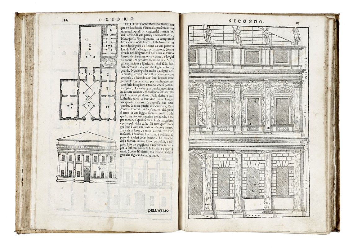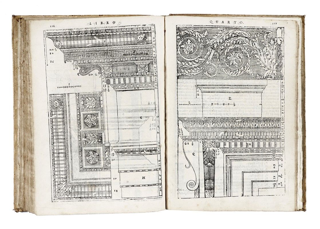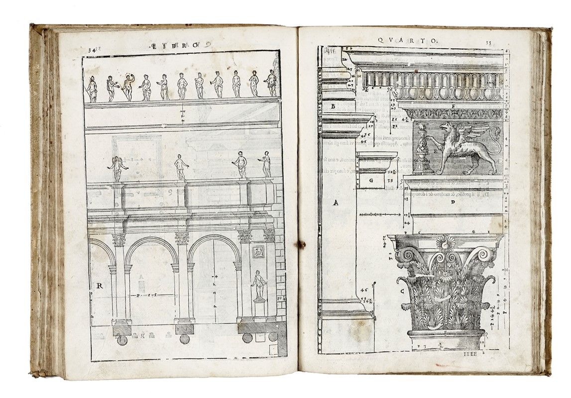 In-folio (mm 307x213) in 4 parti, ciascuna con titolo xilografico architettonico a piena pagina. Pagine: 67, [1, bianca]; 78, [2, bianche]; 46 [2, una delle quali è bianca]; 133, [1 con il colophon e 2 bianche finali]. Profusamente illustrato con xilografie a piena e mezza pagina. Primo forntespizio controfondato, antica mancanza all’angolo superiore delle pagine 7-20 del primo libro, con testo supplito manoscritto da mano antica, le carte BB3-4 nel secondo libro supplite da altro esemplare, macchie e segni d’uso all’interno e altri difetti, ma nel complesso buona copia di studio, in pergamena settecentesca con titolo su tassello al dorso (difetti).