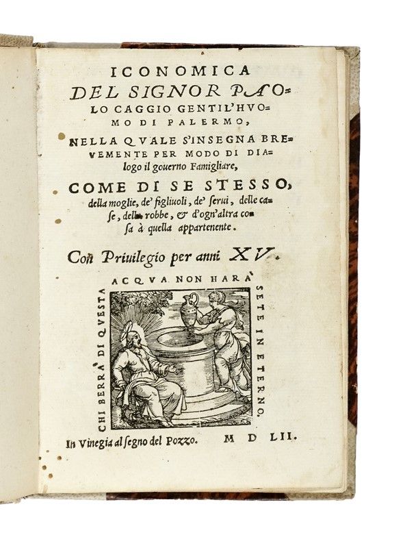 In-8° (mm 142x97) 2 opere in 1 volume. Carte [8], 64. Marche xilografiche al frontespizio e al colophon. Prime carte con forellini di tarlo al margine interno. Qualche annotazione manoscritta. Occasionali, piccole, pallide e marginali fioriture. Rifilato un po' corto al margine superiore. RILEGATO CON: Lantieri Giacomo, Della Economica... In Venetia: Appresso Vincenzo Valgrisi, 1560. Pagine [32], 171, [5]. Marche xilografiche nel frontespizio e in fine.