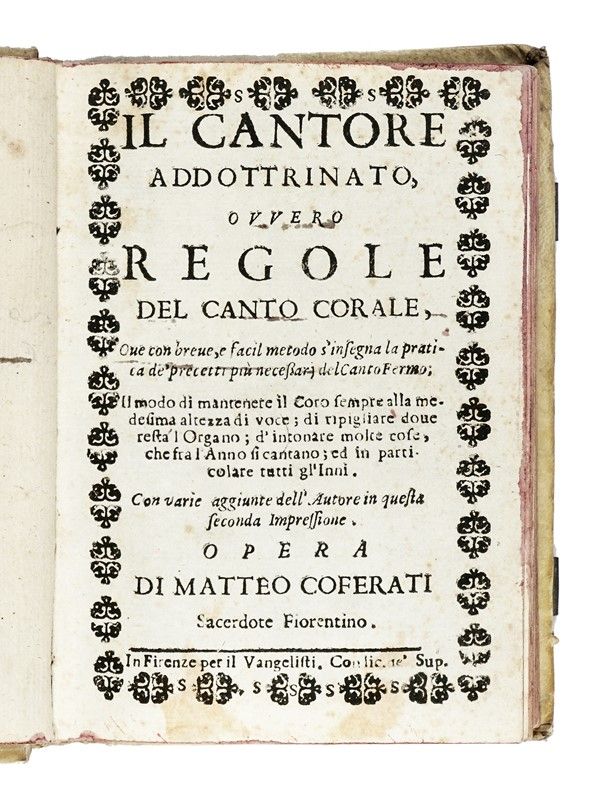 In-8° (mm 139x95). Pagine XVI, 391, [1]. Frontespizio entro graziosa cornice tipografica, due illustrazioni xilografiche a piena pagina di mani guidoniane e molti spartiti. Leggere e trascurabili tracce del tempo. Copia genuina in piena pergamena rigida con fermagli, tagli rossi.