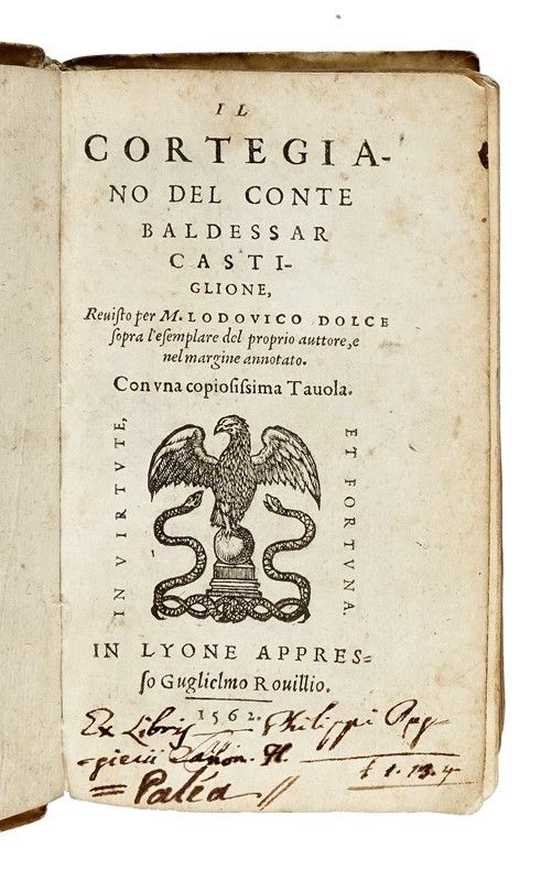 In-16° (mm116x73). Pagine: 494, [34]. Marca al frontespizio, fregi e iniziali xilografici, testo in corsivo. Carte occasionalmente ingiallite, un trascurabile lavorino di tarlo al margine superiore di un paio di fascicoli, ma per il resto buona copia genuina in pergamena flessibile coeva decorata in oro ai piatti e al dorso, tagli dorati (piccola mancanza al dorso e altri minimi difetti).
