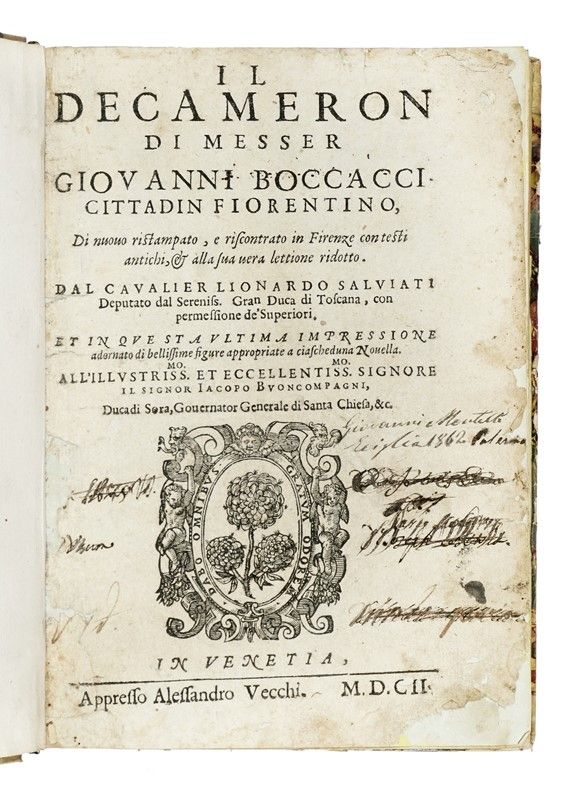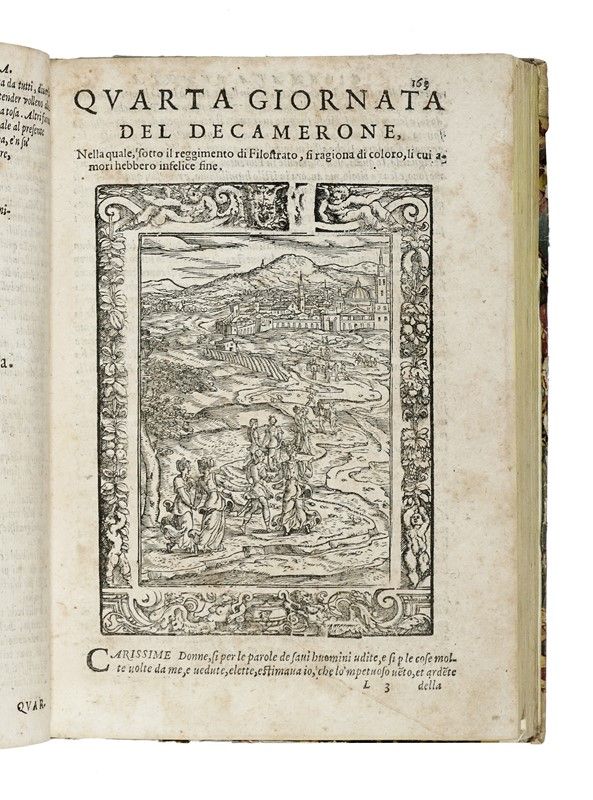 In-4° (mm 200x140). Pagine [20], 400 [i.e. 488 per errori nella numerazione]. Frontespizio rinforzato. Ritratto dell'Autore in ovale a carta [croce]10v, 9 illustrazioni a piena pagina (una per ciascuna giornata esclusa la prima) e numerose figure nel testo a tre/quarti di pagina, il tutto finemente inciso in legno. Carte un po' stanche con occasionali segni del tempo. Mezza pergamena con titoli dorati in tassello al dorso e piatti in carta marmorizzata.