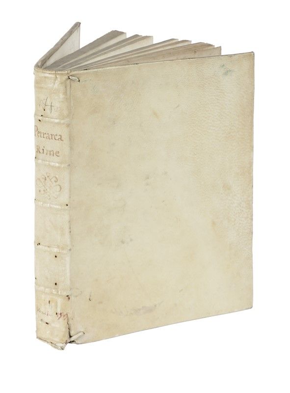 In-4° (mm 212x151). Carte [8], 197, [7]. Frontespizio architettonico, mappa della Valchiusa, ritratto del Petrarca con Laura, 6 vignette xilografiche in apertura ai Trionfi, belle iniziali figurate grandi e piccole, marca tipografica in fine. Testo in corsivo circondato dal commento in carattere tondo dal corpo più piccolo. Frontespizio rifilato e con mancanza all'angolo inferiore esterno, s7 e s8 più corte, restaurate in margine e con parti dei testo anticamente cassate (sono i sonetti i relativi alla cattività avignonese, l“empia babilonia”). Qualche altro lieve e trascurabile segno del tempo. Pergamena rigida settecentesca con titoli manoscritti al dorso (minimi difetti).