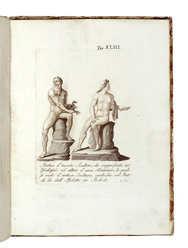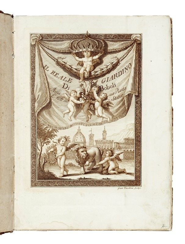 In-4° (mm 285x210). Pagine 80 con 1 frontespizio figurato con veduta ideale di Firenze sullo sfondo, 46 tavole numerate raffiguranti le statue di Boboli e 1 grande pianta più volte ripiegata del Giardino in carta azzurra, il tutto inciso in rame da Gaetano Vascellini e stampato in bistro. Occasionali sbiadite gore e macchioline marginali. Pieno cartonato decorato (dorso con lievi sbucciature).