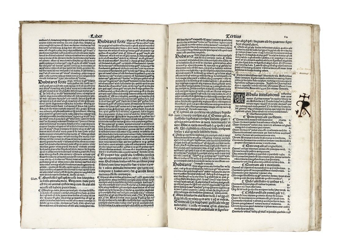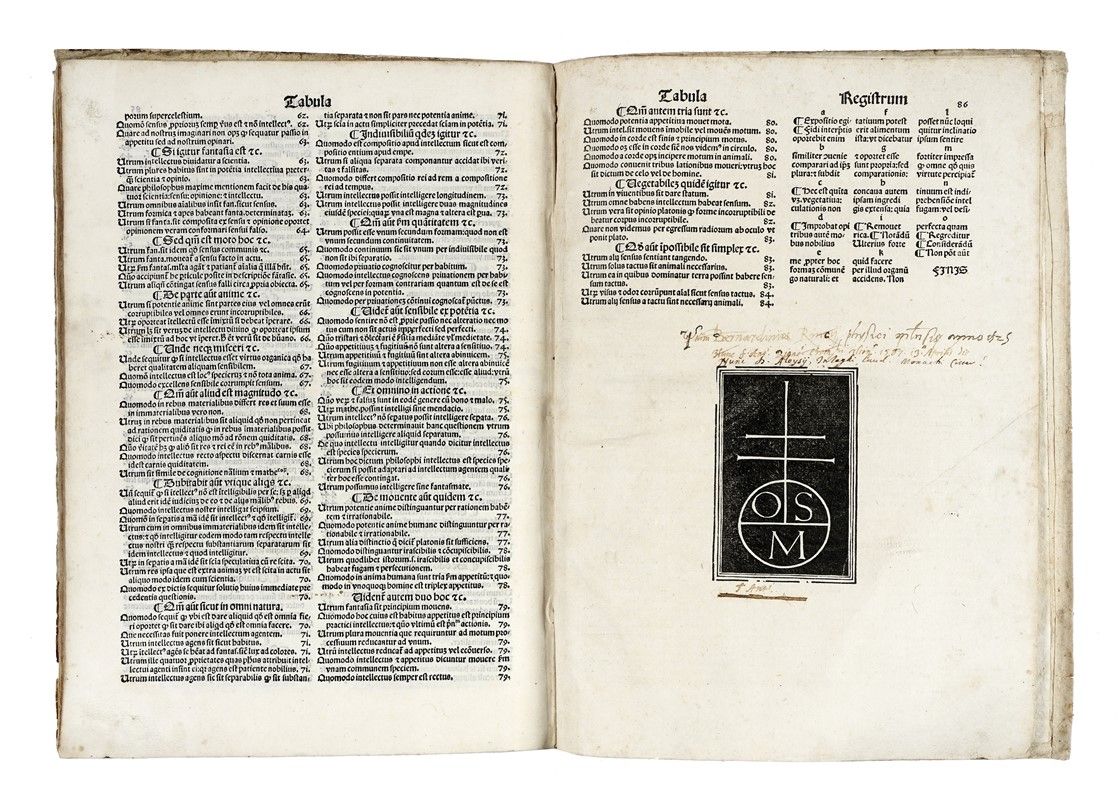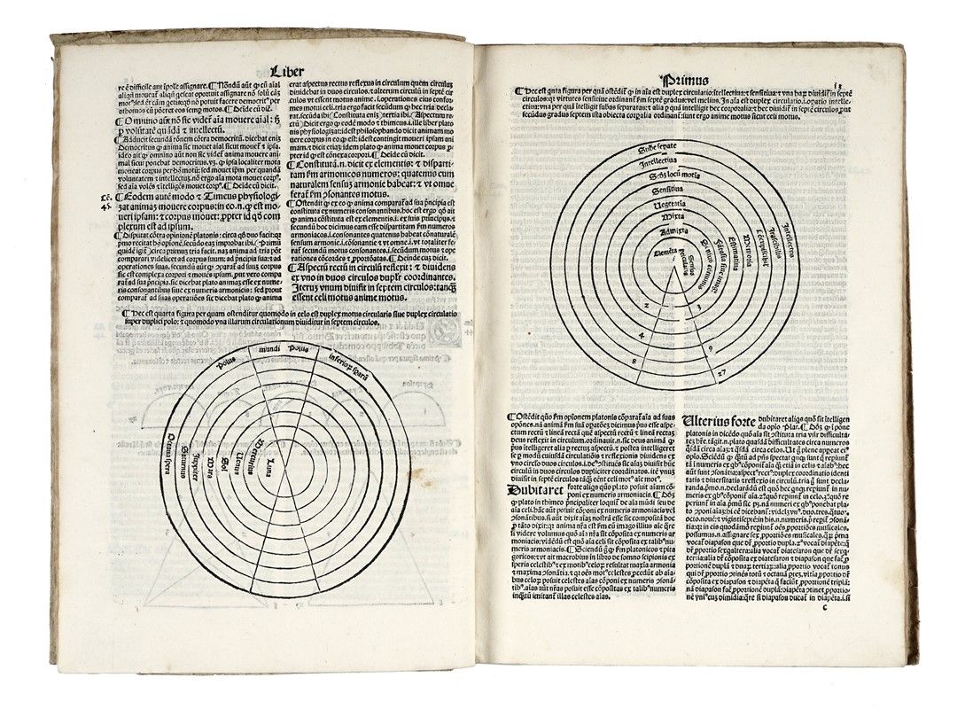 In-folio (mm 290x202). Carte: [86]. Testo in gotico su due colonne con grande iniziale xilografica all'incipit, con più piccoli graziosi capilettera xilografici animati, con 8 diagrammi xilografici, e con grande marca in fine. Qualche occasionale macchietta e altre trascurabili tracce del tempo, ma nel complesso freschissima copia genuina in cartonato rustico posteriore.
