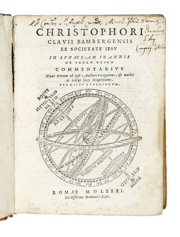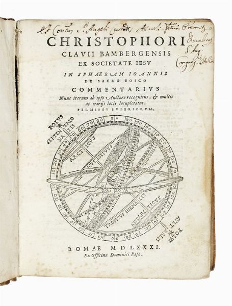 In-4° (mm 206x155). Pagine [32], 467, [1]. Frontespizio con grande xilografia e nota manoscritta di possesso, numerosi diagrammi xilografici e pagine di tabelle nel testo. Pallide e sottili gore marginali intermittenti (più forti in punti). Forellino di tarlo ai primi fascicoli. Occasionali lievi arrossature, e altre trascurabili tracce del tempo. Piena pergamena flessibile coeva (un po' sciupata).
