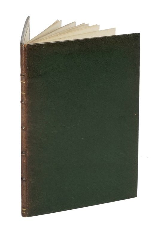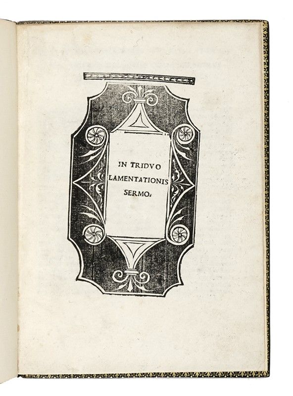In-4° (mm 205x146). Carte: [10]. Frontespizio entro cornice xilografica, 3 iniziali xilografiche (2 più grandi) grande marca xilografica in fine. Margine inferiore dell'ultima carta impercettibilmente restaurato, ma per il resto buona copia in elegante legatura moderna in marocchino verde, dorso a nervi (leggermente sbiadito) con titolo dorato, contropiatti con fini dentelles dorate.