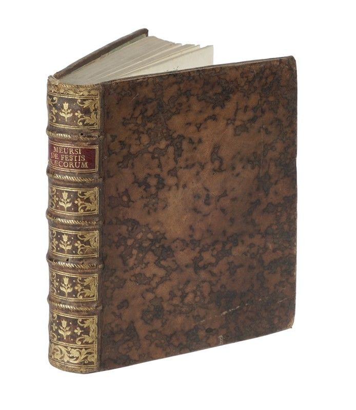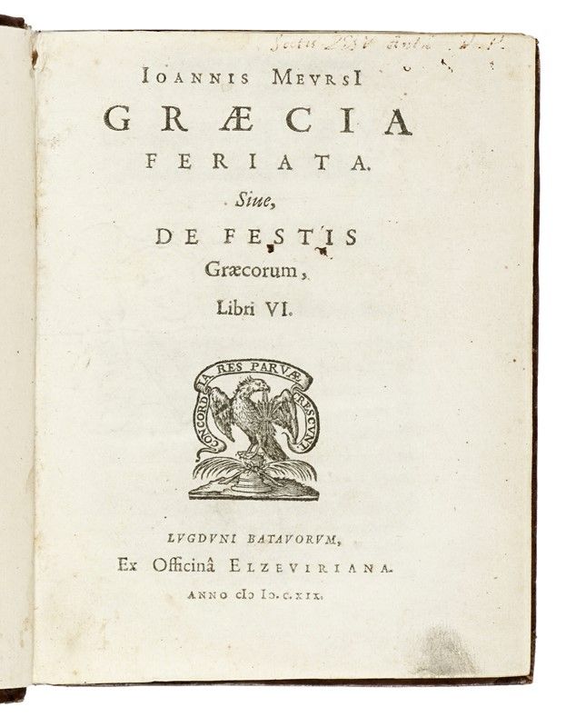 In-4° (mm 182x139). Pagine: [8], 341, [1], ultima carta bianca. Frontespizio con marca editoriale xilografica. Qualche macchiolina ma ottimo esemplare con sguardie marmorizzate. Splendida piena pelle settecentesca, dorso decorato con fregi dorati, nervi e titoli in oro entro tassello in marocchino. [RILEGATO CON:] Meurs Johannes, Ioannis MeursI Eleusinia. Sive, De Cereris Eleusinae sacro, ac festo. Liber singularis. Lugduni Batavorum: ex officina Elzeviriana, 1619. Pagine: [16], 104. [RILEGATO CON:] Meurs Johannes, Ioannis MeursI Panathenaea. Sive, de Minervae illo gemino festo, liber singularis. Lugduni Batavorum: ex officina Elzeviriana, 1619. Pagine: [8], 48.