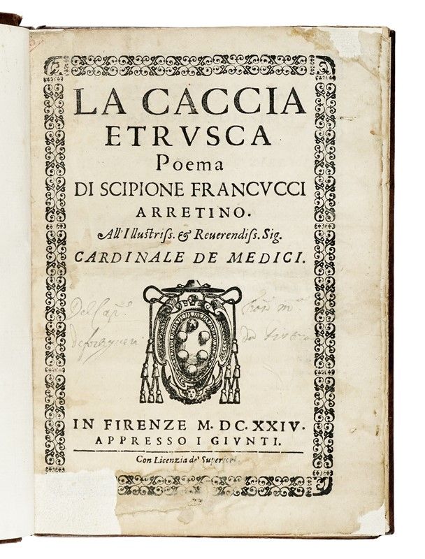 In-4° (mm 220x155). Frontespizio, con stemma xilografico del dedicatario, e pagine di testo in corsivo entro bella cornice tipografica. Iniziali xilografiche. Introduzione ai vari canti con cornice xilografica nel testo. Nota di possesso manoscritta al frontespizio (con restauri ai margini). Restauri alla seconda carta che sfiorano il testo, terza carta con dei piccoli strappetti. Privo delle due carte (¶5 e 6) con l'apologia della caccia, mancanza comune a molti esemplari. Restauri marginali su alcune carte (I7, I8, K1, O8), con tracce di tarlo ai margini dei primi tre fascicoli e sulle ultime due carte. Qualche lieve brunitura. Legatura moderna in pelle con titolo e decori dorati al dorso.