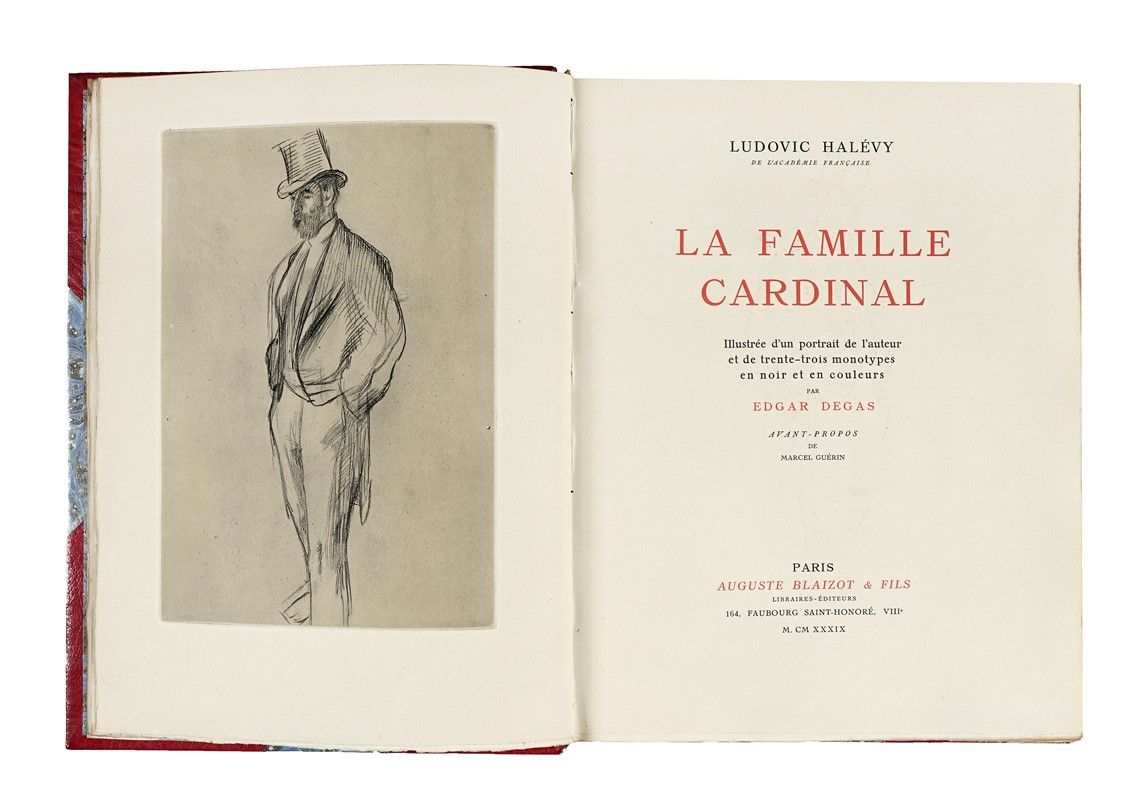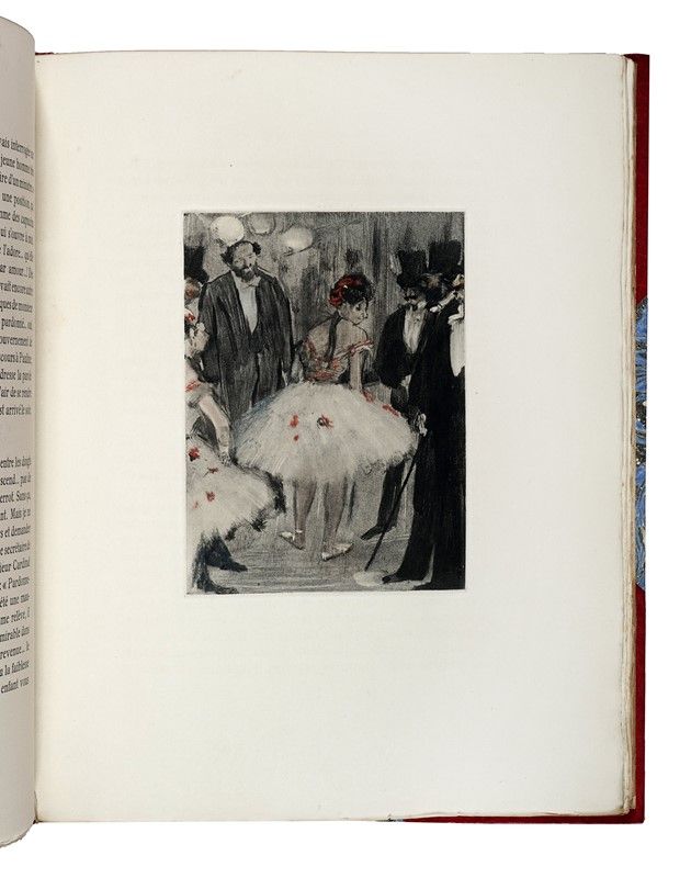 In-4° (mm 320x255). Pagine [2], 161, [3]. Con il ritratto dell'Autore in bianco e nero in antiporta fuori testo, 31 incisioni a piena pagina nel testo, di cui 6 a colori, di Maurice Potin su monotipi originali di Edgar Degas e 2 vignette in bianco e nero nel testo. Ottima copia in barbe. Legatura in mezza pelle con punte e piatti marmorizzati; titoli e fregi in oro al dorso a 5 nervi, sguardie marmorizzate e taglio superiore dorato. Difetti alle cerniere del piatto anteriore e qualche lieve abrasione, altrimenti buona conservazione generale. Uno dei 325 esemplari in numeri arabi su velin Rives filigranata, su una tiratura complessiva di 350 copie. Rilegati all'interno i piatti della brossura editoriale.