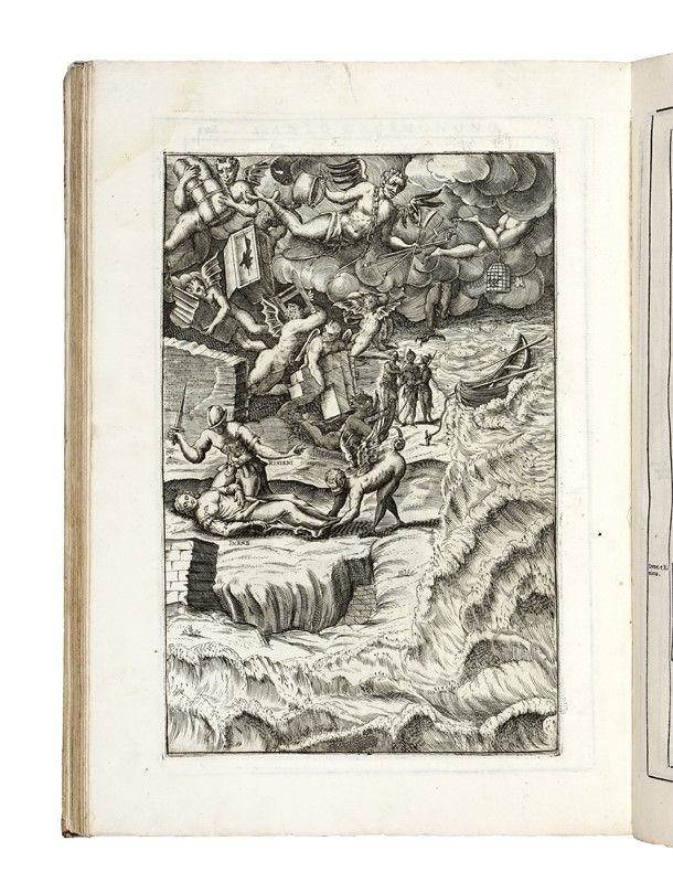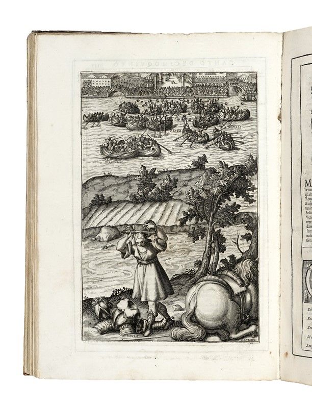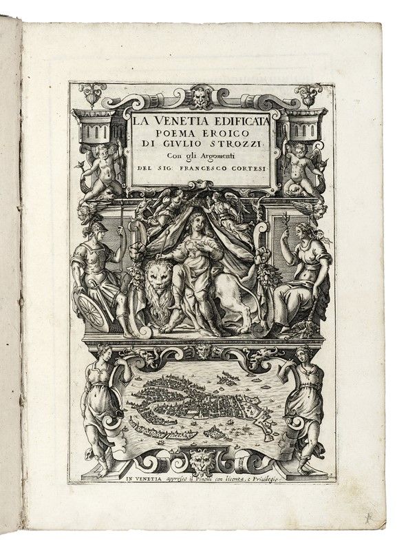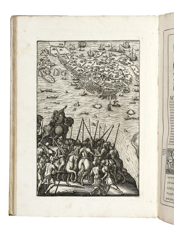 In-folio (mm 330x225). Pagine [24], 248, [8]. Bel frontespizio figurato con allegoria della Repubblica di Venezia e in basso una graziosa pianta della città, 1 ritratto dell'Autore, 2 ritratti di Flavius Aetius e Attila in fine e 24 illustrazioni in apertura di ciascun canto, il tutto inciso in rame a piena pagina da Valesio; testatine, capilettera abitati, finalini e cartigli architettonici in legno nel testo. Esemplare fresco e marginoso. Trascurabili tracce del tempo. Piena pergamena flessibile con titoli manoscritti al dorso (con qualche macchietta ai piatti).