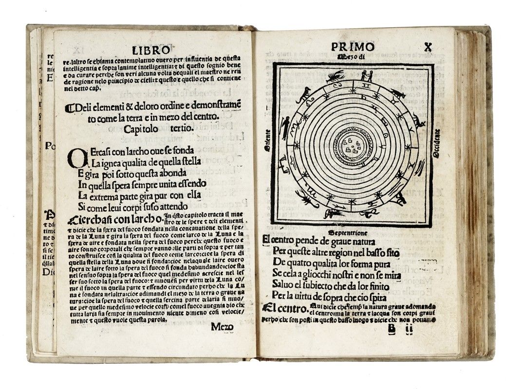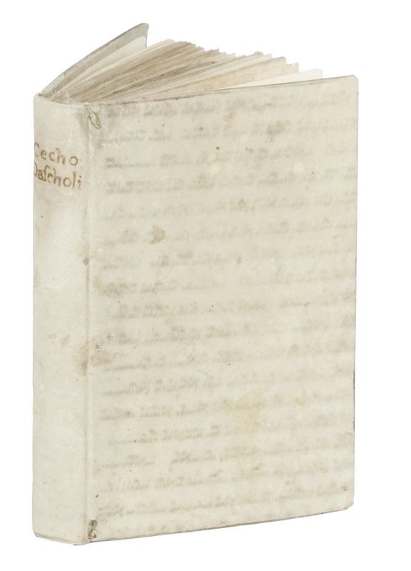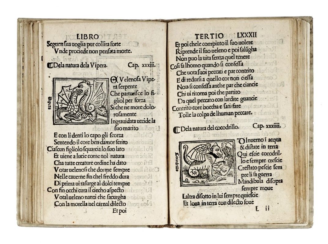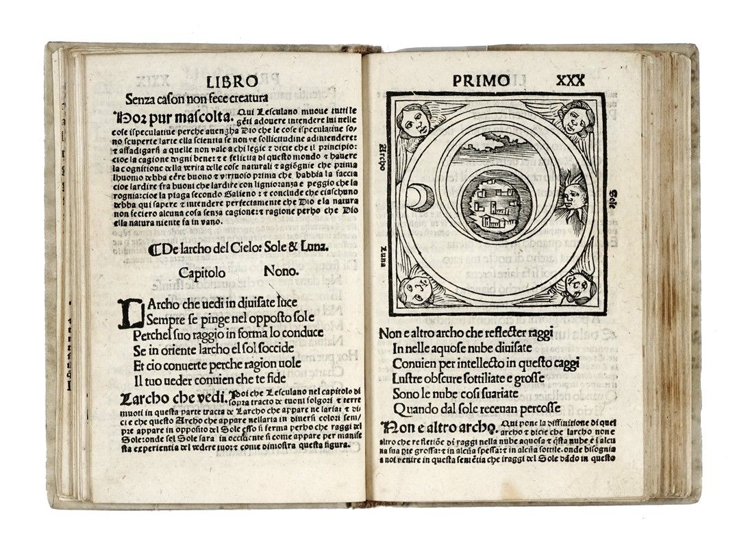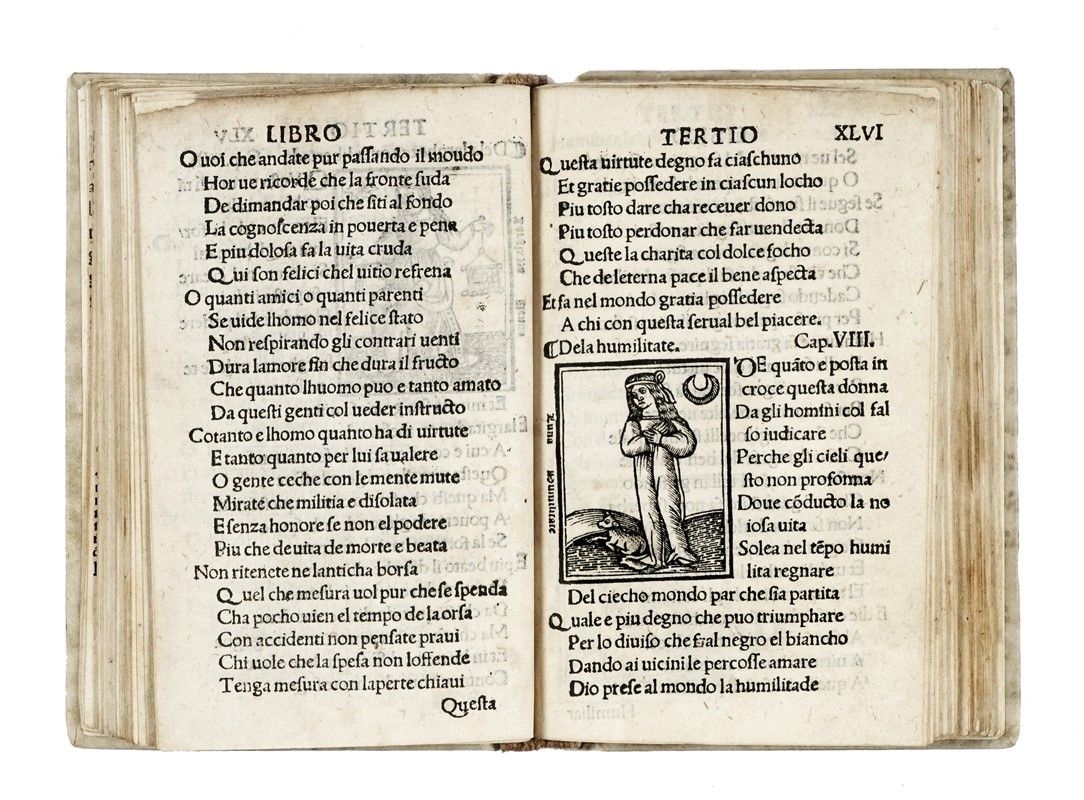 In-8° (mm 145x90), Carte: CXXIX (di CXXXIII, [1], con la carta CXXX supplita in manoscritto da una mano del XVIII secolo. Assenti le carte R2-6 contenenti la fine del testo (che però, come si è detto, è supplita in manoscritto), presumibilmente gli indici, e il colophon). Titolo in rosso con grande xilografia a 2/3 di pagina, testo in tondo, interamente illustrato con 76 xilografie (di probabilmente 78). Frontespizio rifilato al margine esterno con lieve perdita delle lettere del titolo e del margine esterno della xilografia, e con piccolo risarcimento all'angolo inferiore, margine esterno corto e in alcuni casi rifilato con minime perdite. Legatura posteriore ricavata da un foglio di pergamena manoscritto in ebraico.