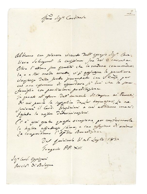 Manoscritto a inchiostro bruno. Un bifolio in carta con filigrana, scritta 1 pagina. Conservato foglio ripiegato a busta con indirizzo autografo e sigillo papale in ceralacca rossa. Il tutto in perfette condizioni. Dimensioni bifolio: 195x260 mm.
