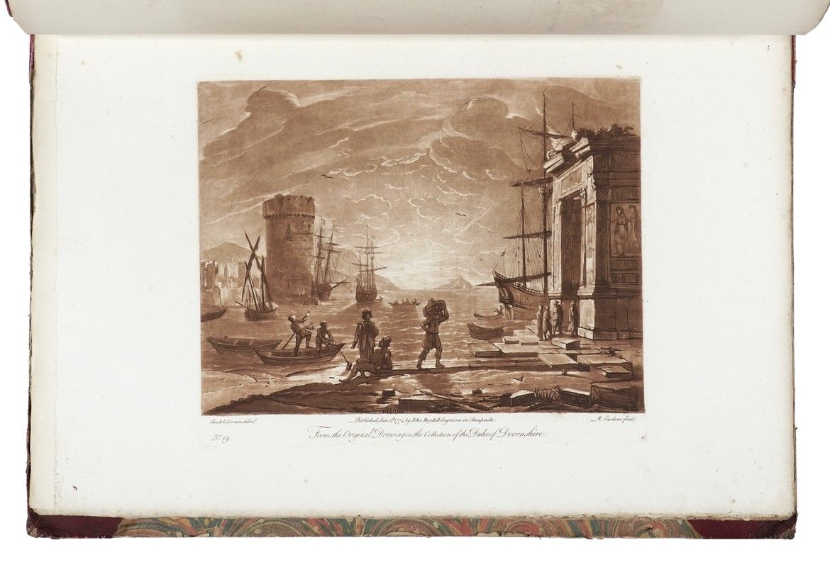 In-folio (mm 440x280). Pagine all'inizio di ciascun volume: 14, 6, [8]. Ogni volume è completo delle 100 tavole calcografiche stampate in bistro, per un totale di 300 tavole, ognuna con la sua velina di protezione. Il volume I e II hanno rispettivamente all'antiporta il ritratto calcografico di Richard Earlom e Claude de Lorrain. Assente il ritratto nel terzo volume. Occasionali fioriture marginali. Carte in barbe. Mezzo marocchino rosso con punte, piatti marmorizzati e titoli dorati ai dorsi (un po' sbiaditi e con qualche piccola sbucciatura).