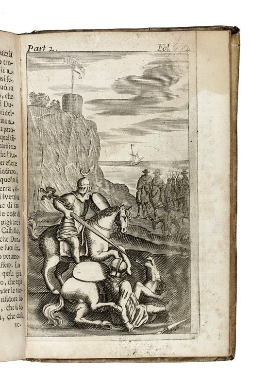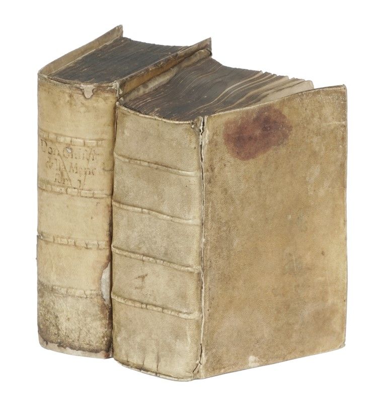 2 parti in due volumi in-8° (mm 160x105). Pagine:[20], 688, [9] carte di tavola di cui un'antiporta; [16], 730, [2], [9] carte di tavola di cui un'antiporta. Primo volume con la carta di tavola a p72 con strappo e mancanza all'angolo superiore esterno, antiporta del secondo volume strappato con perdite. Buona copia con pallide gore, qualche sporadica lieve arrossatura, leggere fioriture e altri minimi segni del tempo. Piena pergamena coeva con difetti lungo le cerniere e sguardie restaurate, piatto anteriore e dorso del secondo volume parzialmente staccato, tagli spruzzati.