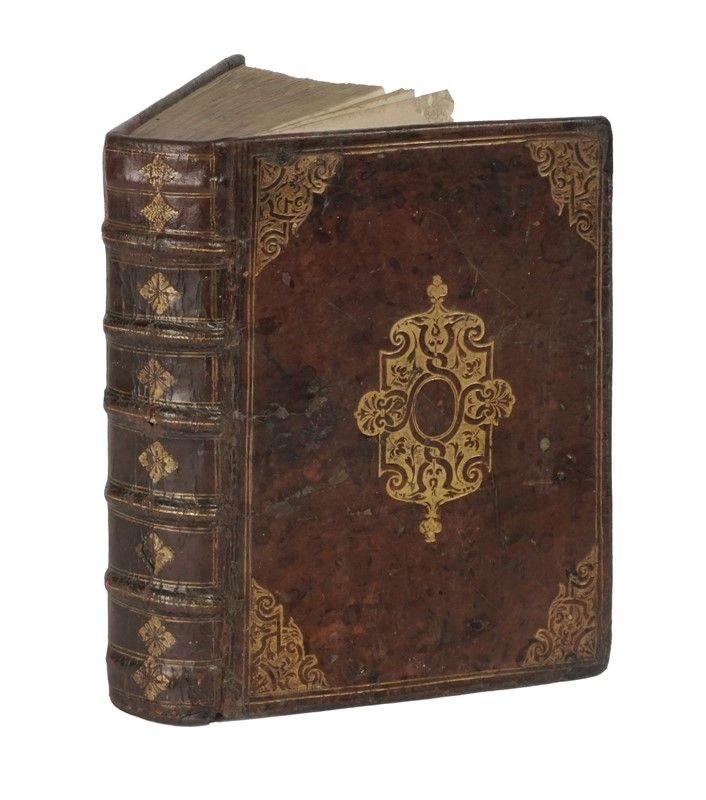 In-4° (mm 226x168). Carte: [10], 482, [2]. Eleganti fregi e iniziali xilografici. Assenti le carte 3E2-3, una pallida gora marginale ad alcuni fascicoli, e altre trascurabili tracce del tempo. Legatura parigina coeva in vitellino marrone decorato in oro, piatti riquadrati da doppio filetto con grande placca dorata al centro e decorazioni agli angoli, dorso a nervi decorato con fleurons e filetti dorati, tagli dorati (qualche abrasione e traccia d'uso). Buon esemplare interamente rubricato, con ex libris dell'abate Amédée-Aimé Guillotin (1837-1905), sacerdote e storico francese, specialista in storia della Bretagna.