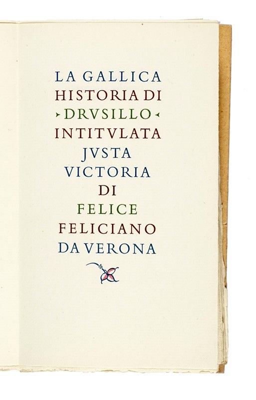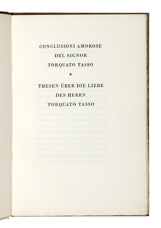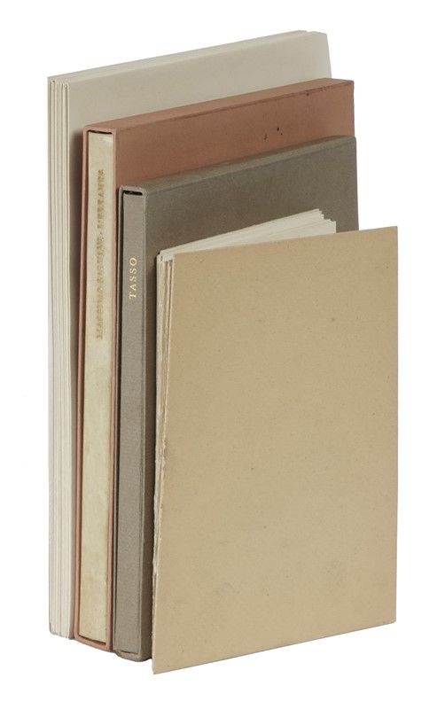Compongono il lotto: 1) Tasso Torquato, Thesen uber die liebe. (Al colophon:) Verona: Officina Bodoni, 1942. In-8° (mm 195x133). Legatura editoriale in cartonato Ingres grigio e monogramma GBH in oro sul piatto anteriore, con astuccio editoriale coordinato. Esemplare non numerato di una tiratura di 300 esemplari; 2) Feliciano Felice, La Gallica Historia di 'Drusillo' intitulata Justa Victoria... (Al colophon:) Verona: Officina Bodoni, 1943. In-8° piccolo (mm 170x100). Con 2 illustrazioni a colori nel testo. Esemplare intorno, non rilegato e non numerato, su una tiratura dichiarata di 132 copie. 3) Rilke Rainer Maria, Lettres à une amie vénitienne. (Al colophon:) Verona: Officina Bodoni, 1941.In-8° (254x172). Con 1 acquaforte originale di Mario Vellani Marchi al frontespizio. Testo in francese e tedesco. Esemplare intonso, perfettamente conservato nelle sue barbe e non rilegato. Uno dei 20 esemplari di servizio, non numerati, su una tiratura complessiva di 420 copie su carta a tino Magnani; 4) Salvani Massimo, L'errante. Verona: Officina Bodoni, 1943.