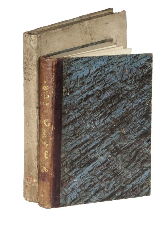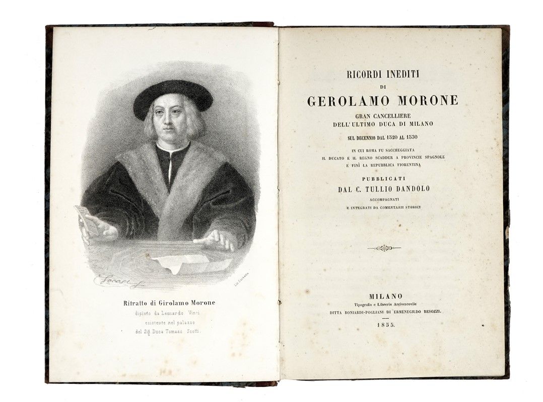 Compongono il lotto: Tassi Francesco Maria, Vite de’ pittori scultori e architetti bergamaschi... Tomo I (di II, manca il secondo). In Bergamo, dalla Stamperia Locatelli 1793. In-4° piccolo in barbe e cartonato rustico coevo, non collazionato. Cicognara, 2375. [SI AGGIUNGE:] Dandolo Tullio, Ricordi inediti di Gerolamo Morone, gran Cancelliere dell’ultimo Duca di Milano sul decennio dal 1520 al 1530 in cui Roma fu saccheggiata e finì la Repubblica Fiorentina... Milano, Ditta Boniardi-Pogliani di Ermenegildo Besozzi, 1855. In-4° in mezza pelle coeva, dorso liscio decorato in oro, non collazionato. Bel ritratto litografico di Morone all’antiporta (inciso da Focosi) e un fac-simile autografo a doppia pagina. Edizione originale. Milano nei suoi libri e stampe, n. 660.