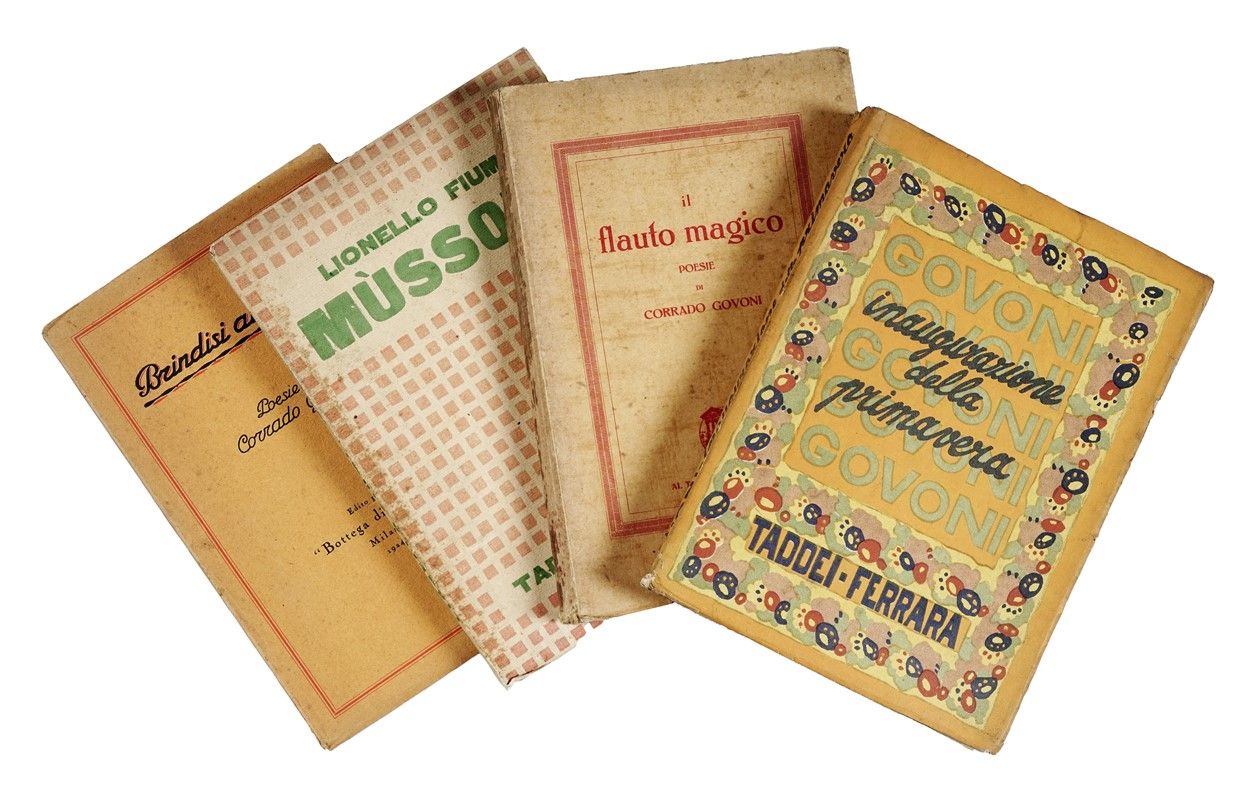 Compongono il lotto: 1) Govoni Corrado, L’inaugurazione della primavera. Ferrara: Taddei, 1920; 2) Id., Brindisi alla notte. Milano: Bottega di Poesia, 1924; 3) Id., Il flauto magico. Poesie. Roma: Al tempo della Fortuna, 1932; 4) Fiumi Lionello, Mùssole. Ferrara: Taddei, 1920. Le opere presentano difetti alle brossure editoriali.
