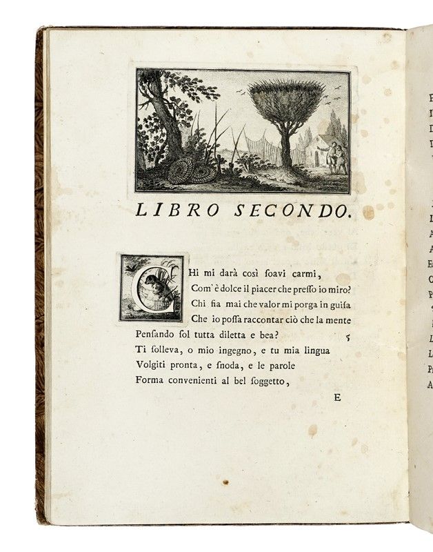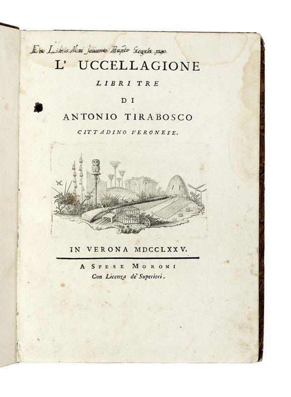 In-4° (mm 260x185). Pagine [4], 116. Frontespizio con bella vignetta calcografica raffigurante i vari strumenti dell'uccellagione. Testatina calcografica all'inizio del libro secondo e terzo. Ex libris al piatto anteriore, nota di possesso manoscritta alla sguardia e al margine superiore del frontespizio. Occasionali macchiette. Gore sbiadite in alcune parti. In cartonato coevo.