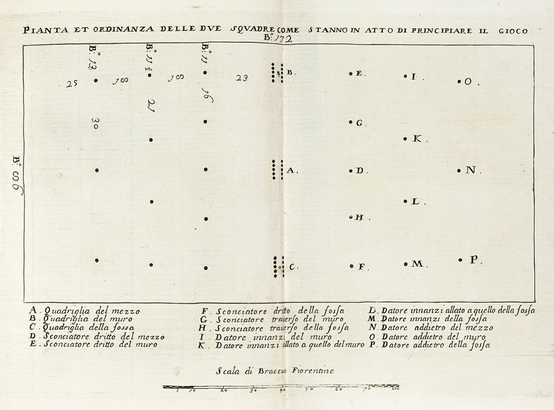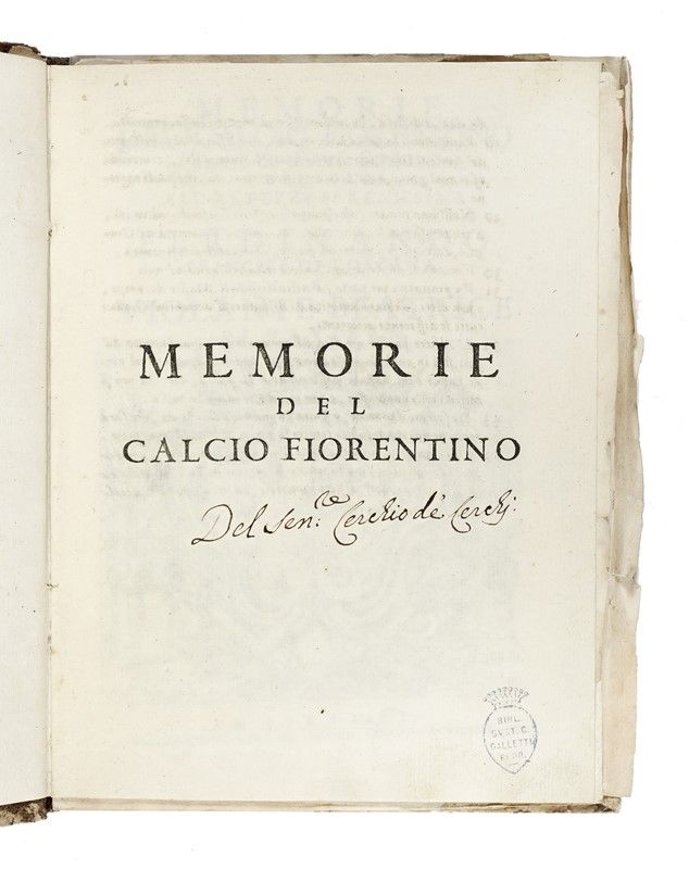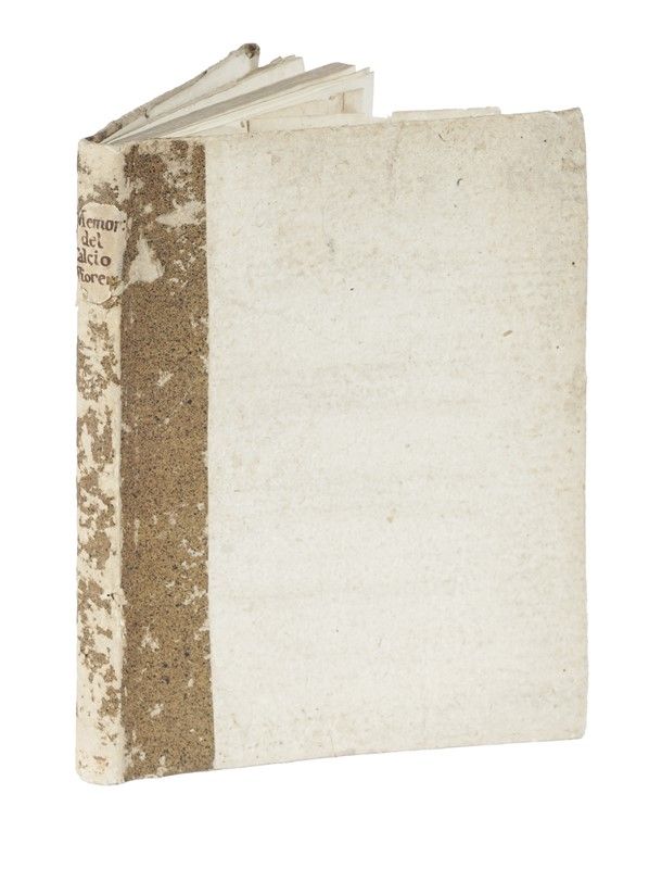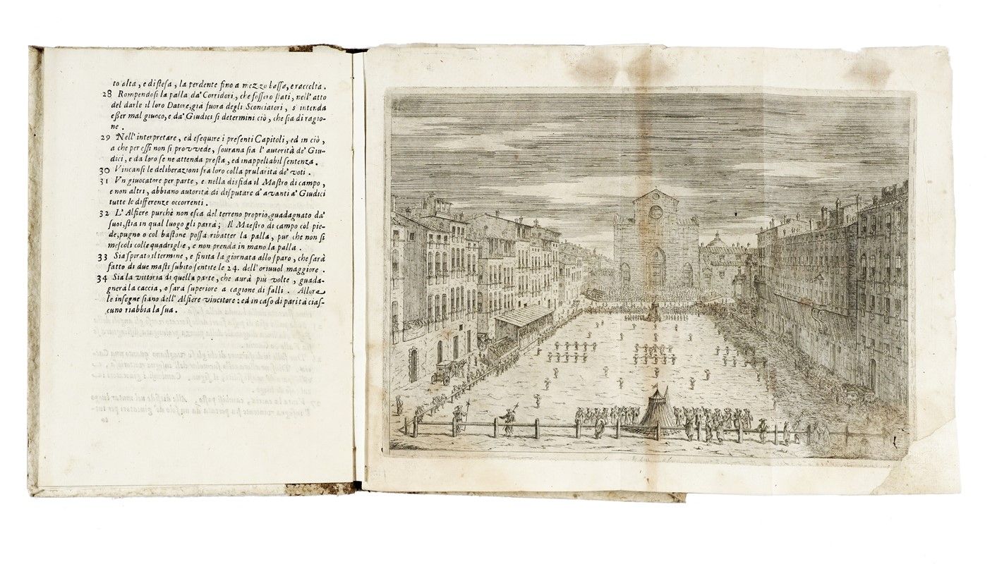 In-4º (mm 230x165). Pagine [12], 118, con 2 tavole fuori testo ripiegate raffiguranti la pianta del gioco del calcio e la veduta di Piazza Santa Croce con la disposizione delle squadre. Ampia marca calcografica al frontespizio; testatine e capilettera in legno. La tavola di Santa Croce, sciolta e leggerissimamente più grande (quindi forse da altra copia), ha un restauro all'angolo inferiore destro e qualche piccolo alone. Antica firma di appartenenza "Del Sen.re Cerchio de' Cerchi" all'occhiello (forse Alessandro Cerchio de' Cerchi, cavaliere senatore eletto accademico nel 1696), timbro Galletti al frontespizio. In cartonato con titoli manoscritti in tassello al dorso. Aggiunta sciolta in fine tavola calcografica extra raffigurante "Scala di braccia Fiorentine".