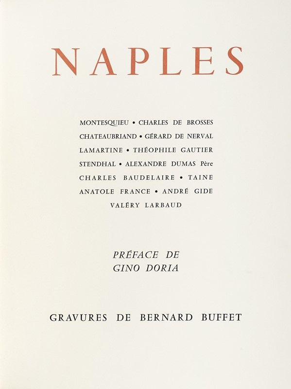 In-4° grande (mm 380x285). Esemplare a bifoli sciolti, perfettamente conservato nelle sue barbe, con 14 puntesecche di Bernard Buffet a piena pagina nel testo, protette da velina. Entro cartella e cofanetto editoriale con difetti ai piatti e alle cerniere. Uno dei 300 esemplari numerati e firmati a matita dall'Artista su papier pur fil d'Arches.