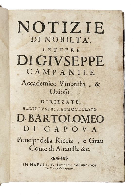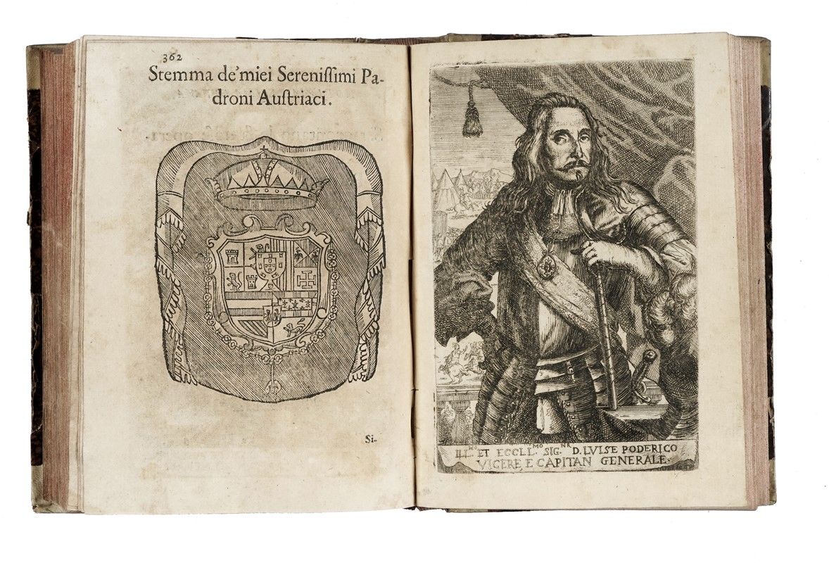 In-4° (mm 200x134). Pagine [32], 510, [2] e [3] carte di tavole calcografiche su [5] riportate da SBN. Antiporta allegorica calcografica. Fregi e stemmi nel testo xilografici. Carte ingiallite e alcune brunite. b3 e b4 con strappi e cancellature al testo, altri trascurabili segni del tempo. Mezza pergamena con punte, piatti marmorizzati e titoli dorati in tassello al dorso.