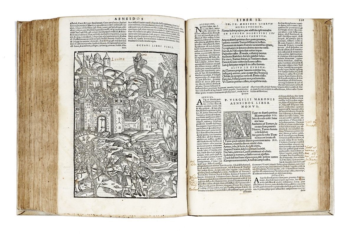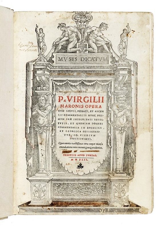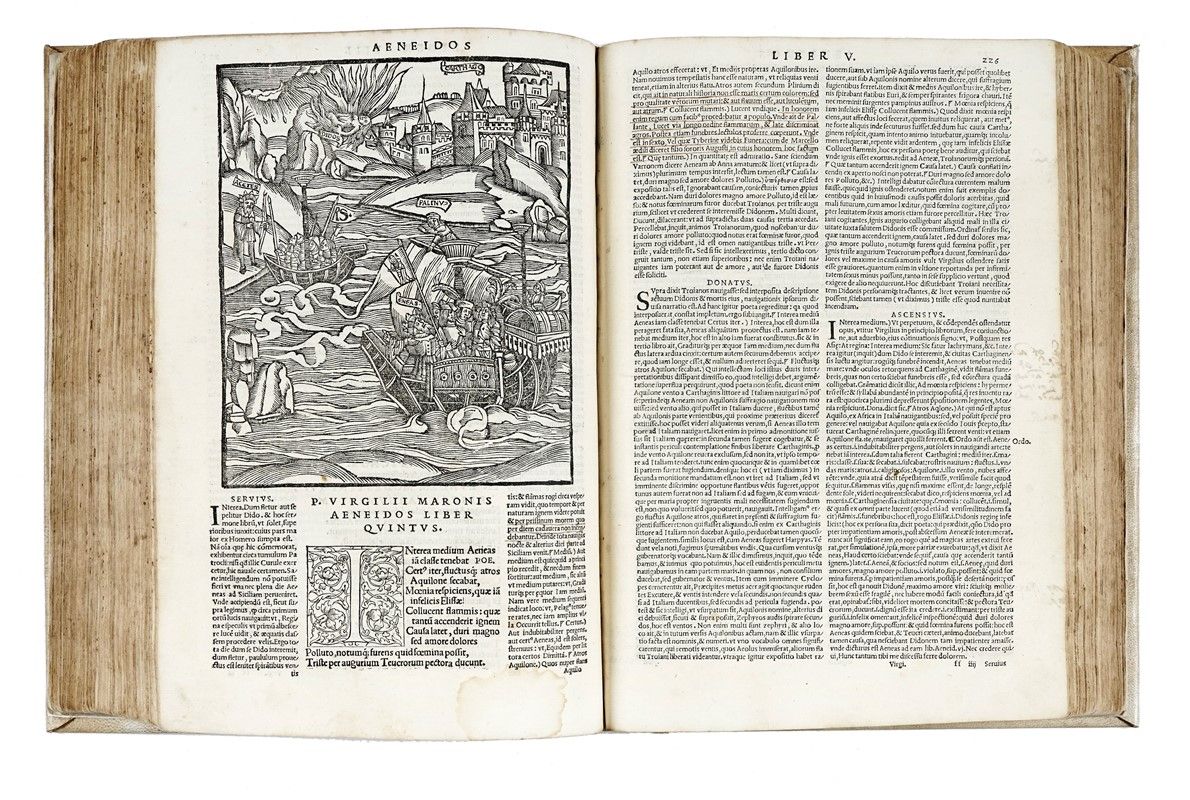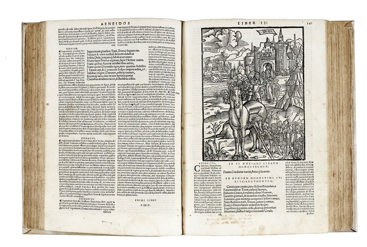 In-folio (mm 192x202). Carte [8], 479, [1]. Frontespizio xilografico stampato in rosso e nero e numerose belle illustrazioni xilografiche. Testo in corsivo, greco e romano. Margine superiore un po' corto e in rari casi rifilato, frontespizio con restauro al margine esterno e con altri piccoli difetti, alcuni lavoretti di tarlo alle prime carte all'angolo inferiore (toccano il testo), una pallida gora da a1 a b4 e da 3l2 a 3n8, alone all'angolo esterno superiore di o4-6, strappetto ad 2a2, mancanze senza perdite al margine esterno di 2l3, all'angolo superiore di 2m3 e all'attacco di 2z1, lavoretto di tarlo che non tocca il testo al margine esterno inferiore da 3d8 a 3g4 e al margine interno superiore da 3g2 a 3h8, ultime due carte leggermente più corte e con restauri marginali, ma nel complesso buona copia con numerose antiche postille (talvolta rifilate), in piena pergamena posteriore con titoli dorati in tassello al dorso.