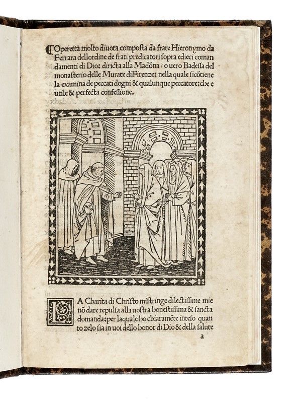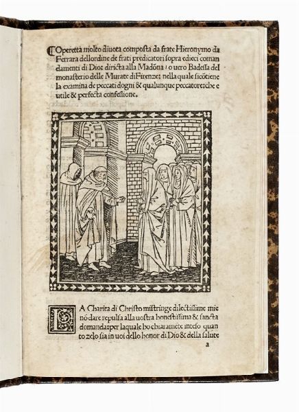 In-4° (mm 185x125). Carte: [30], collazionato completo. Qualche macchiolina, pallida gora e altri minimi segni del tempo, restauro quasi impercettibile all'angolo superiore esterno della prima carta. Iniziali xilografiche e due eleganti xilografie alla prima ed ultima carta raffiguranti il Savonarola a colloquio con la badessa e le consorelle del Monastero delle Murate e in fine la scena della Crocifissione con la Vergine, San Giovanni e Maria Maddalena. Sguardie rinnovate e legatura in piena pelle maculata, tagli spruzzati di rosso.