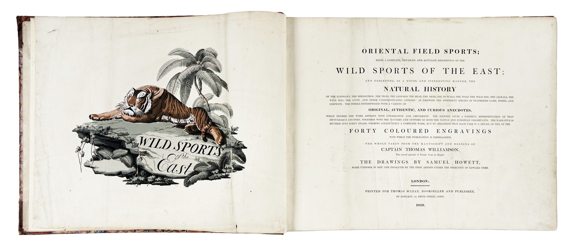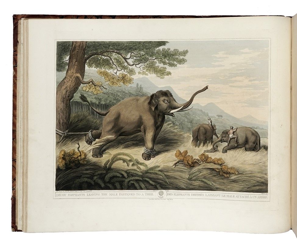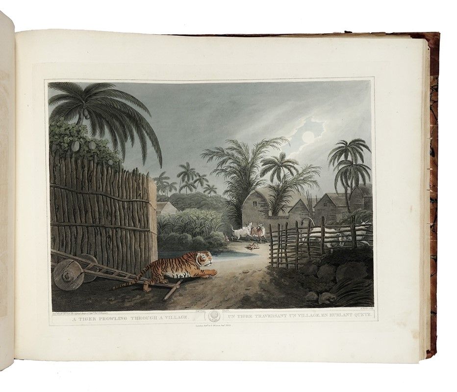 In-folio grande (mm 450x570). Collazionato completo con antiporta con grande acquatinta colorata che ritrae una tigre, pagine [vi], ii, 146, [4] e 40 belle acquetinte colorate a mano. Alcuni margini restaurati con rinforzi in carta, segni di piegatura all'antiporta e alle prime ed ultime carte. Mezza pelle coeva con punte e piatti marmorizzati, dorso con tassello in marocchino rosso e fregi dorati (piccole spellature alle estremità).