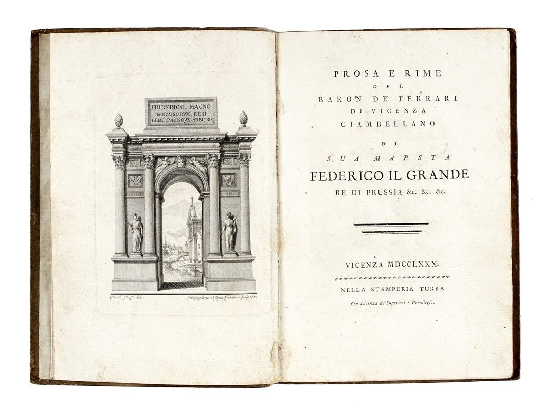 In-8° grande (mm 243x161). Pagine: [4 bianche], 127, [5 bianche], che includono l’antiporta e il ritratto di Federico il Grande, e 8 illustrazioni testuali di vario formato, il tutto inciso su rame da Cristoforo Dall'Acqua. Cartone originale (mancanze alle estremità del dorso e qualche sbucciatura), tagli spruzzati di rosso. Esemplare marginoso stampato su bella carta spessa e fresca.