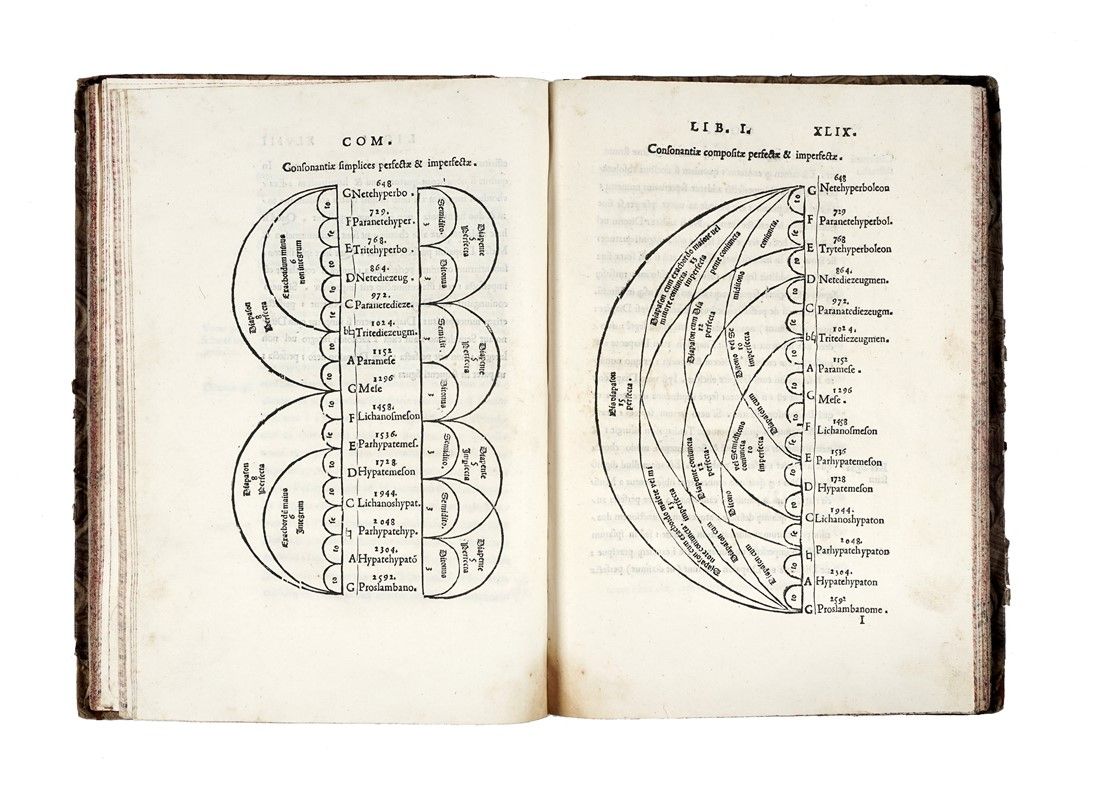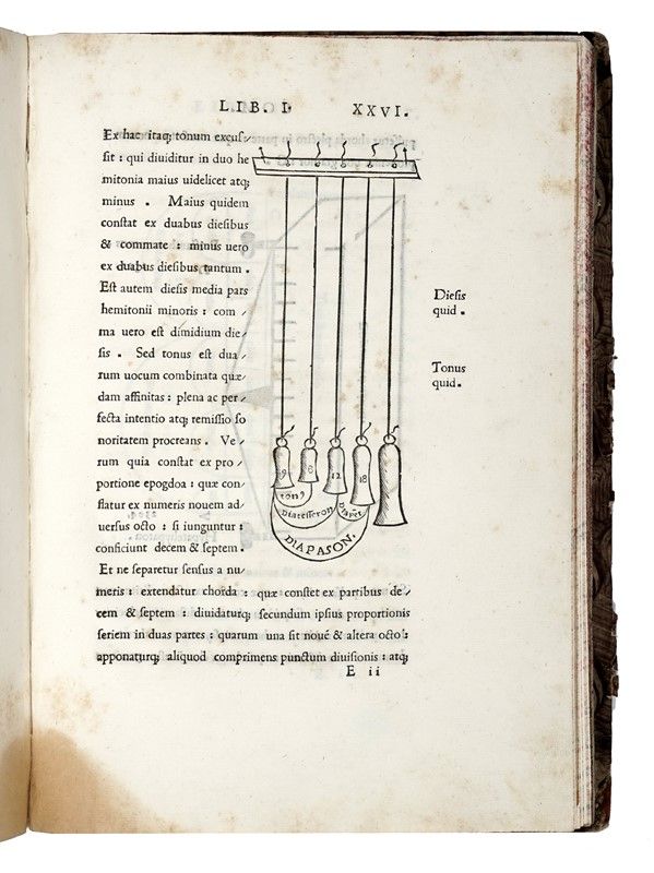 In-folio (mm 295x208). Carte: [19, di 20], [20, di 22], [14], CXXXVIII [1, di 2]. Assenti D4 bianca, L3-4, ed &4 bianca in fine, fascicoli M5-6 provenienti da altra copia più corta e rimarginati, fascicoli segnati con la croce ben presenti ma rilegati tra 2D4 e A. Alone intermittente al margine inferiore/interno, pallida gora marginale agli ultimi fascicoli e altri minori difetti. Testo stampato in latino e greco, splendidamente illustrato con 36 schemi musicali xilografici (a mezza pagina o a piena pagina) nella sezione contenente De musica (dal f. XXVI verso, a LIX recto, completo di tutte le carte). Mezzo vitello marrone di fine settecento, dorso liscio con tassello e fregi dorati, piatti marmorizzati. tagli spruzzati di rosso (sbucciature e abrasioni).