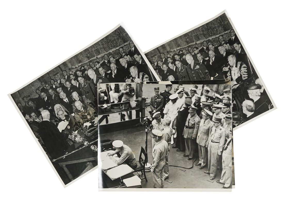 Fotografie in b/n in grande formato (alcune più piccole, tre fotostampe). La maggior parte reca, incollato sul retro, un foglietto dattiloscritto in inglese con la descrizione dell’immagine. Foto distribuite all’epoca dall’OWI (Office War Information) e dall’U.S.I.S. (United States Information Service). Dimensioni: 360x285 mm ca.