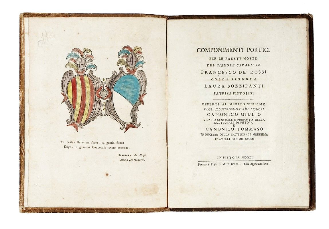 Documenti a stampa. Eleganti edizioni per nozze, stampate a tiratura limitata in omaggio a coppie di sposi nobili o socialmente importanti, legate in brossure o cartonature. Alcuni esemplari con ex libris Pieri Gerini. Alcuni esemplari a fogli chiusi. Edizioni stampate a Pistoia, Roma, Livorno, Firenze, Lucca, Padova, Cortona, Rovereto, Siena, Massa, Bologna, Napoli, Venezia, Vicenza ecc. In ottimo e buono stato (un sonetto con una mancanza di carta). Nel lotto anche 3 volumetti di argomento vario. Contengono raccolte di poesie, novelle, racconti, proverbi, curiosità ecc. Dimensioni varie.
