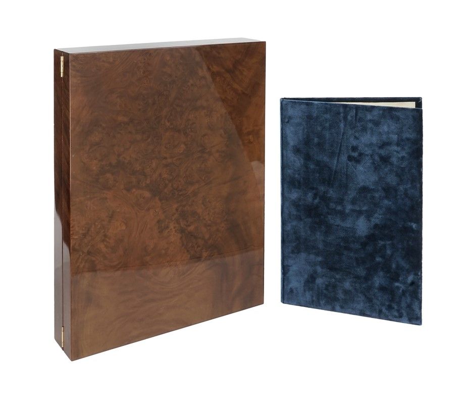 1 volume in-4° (mm 379x235) contenente il facsimile dell'opera in elegante legatura in velluto blu e 1 volume di Commentario in-8° (mm 270x175). Il tutto perfettamente conservato entro splendido cofanetto in radica, con piatto posteriore in pelle e fermaglio dorato. Un graffio e una piccola ammaccatura al piatto anteriore del cofanetto, altrimenti ottimo esemplare. Tiratura in 300 esemplari numerati.